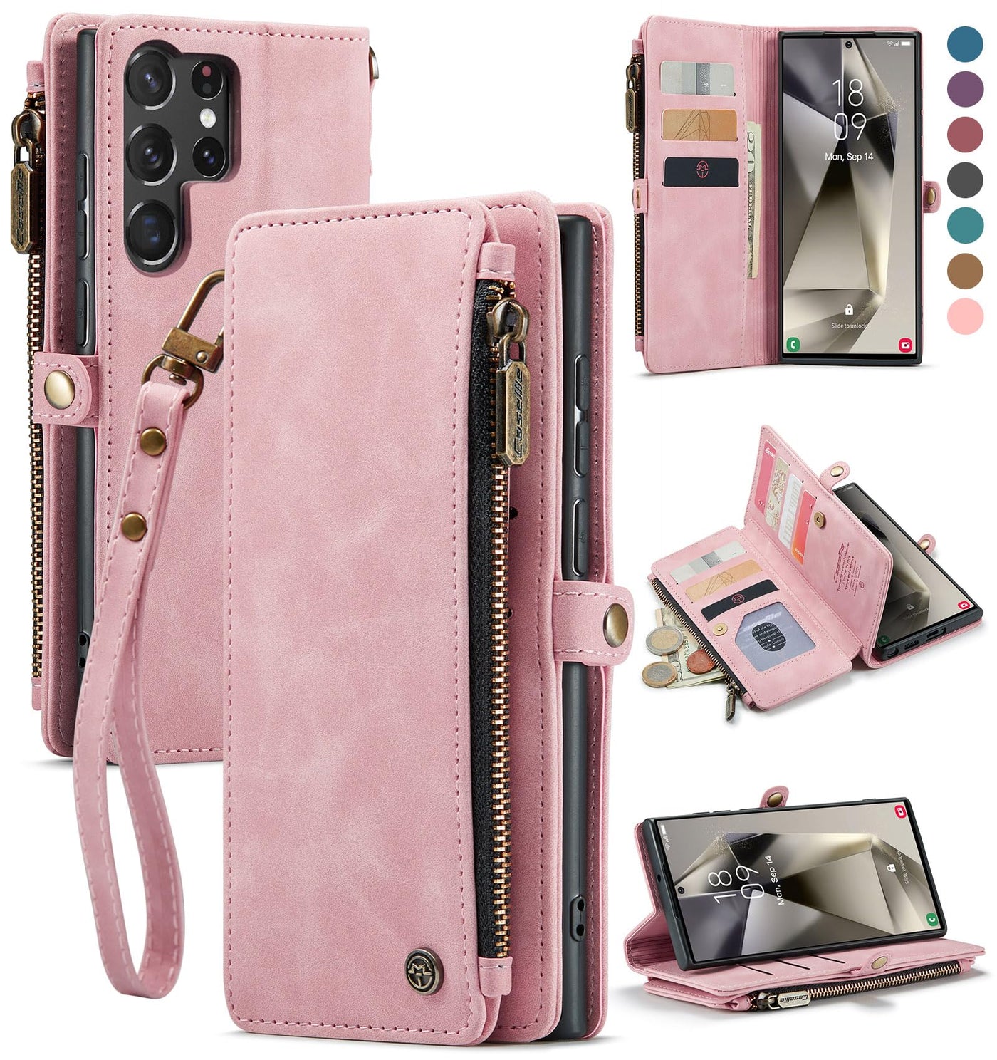 Defencase Samsung Galaxy S23 Ultra Case, Samsung S23 Ultra Wallet Case For Women Men, Fashion Pu Leather Magnetic Flip Strap Zipper Card Holder Phone Case For Galaxy S23 Ultra 68, Elegant Rose Pink