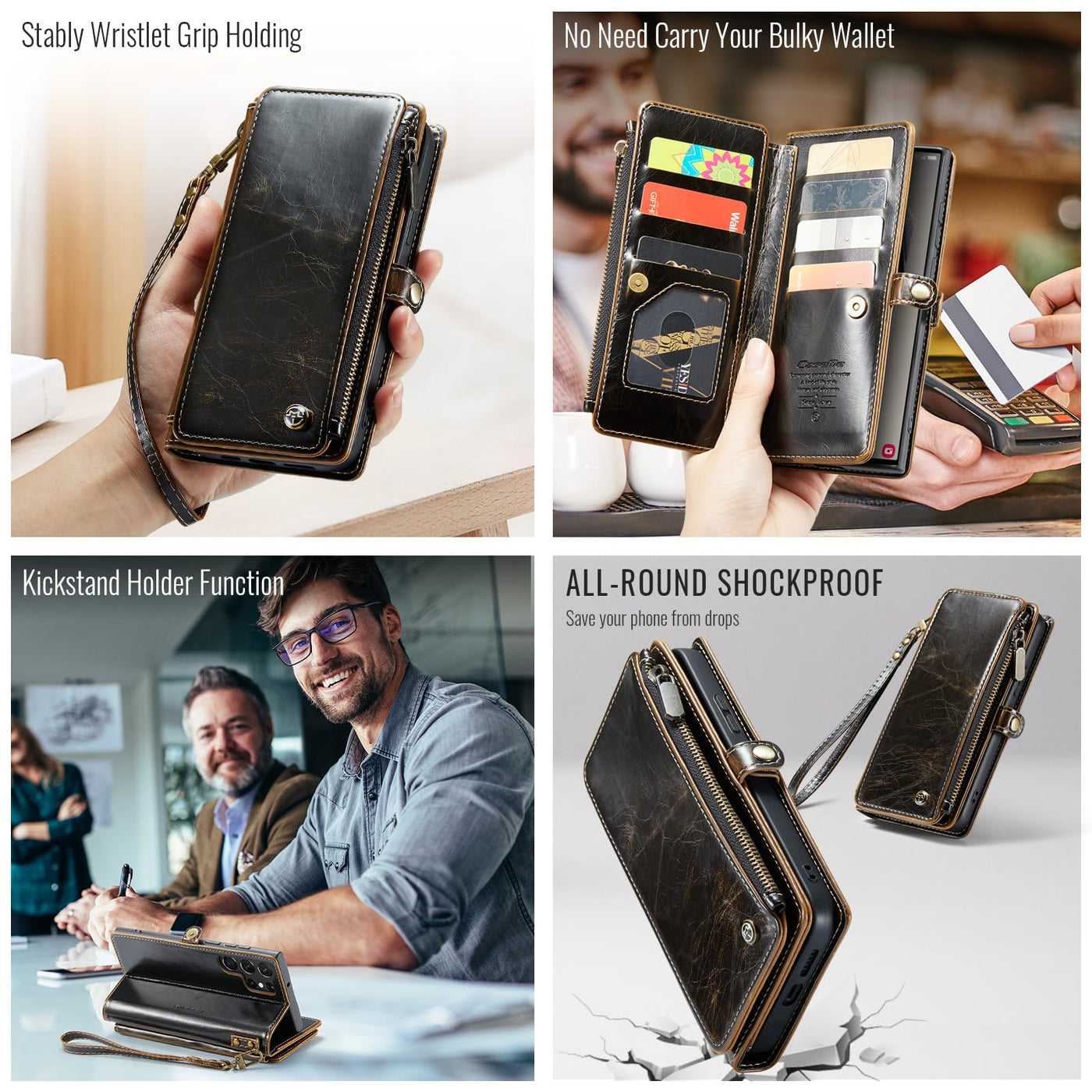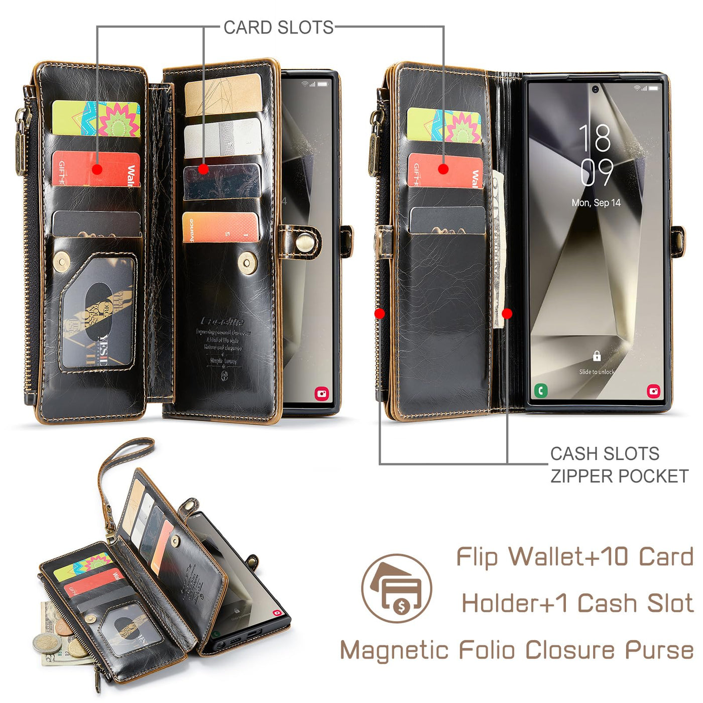 Q: How many cards can this wallet case hold?A: The wallet case includes 10 card slots, a zipper pocket, and cash slots, allowing you to carry your ID, credit cards, and cash conveniently.