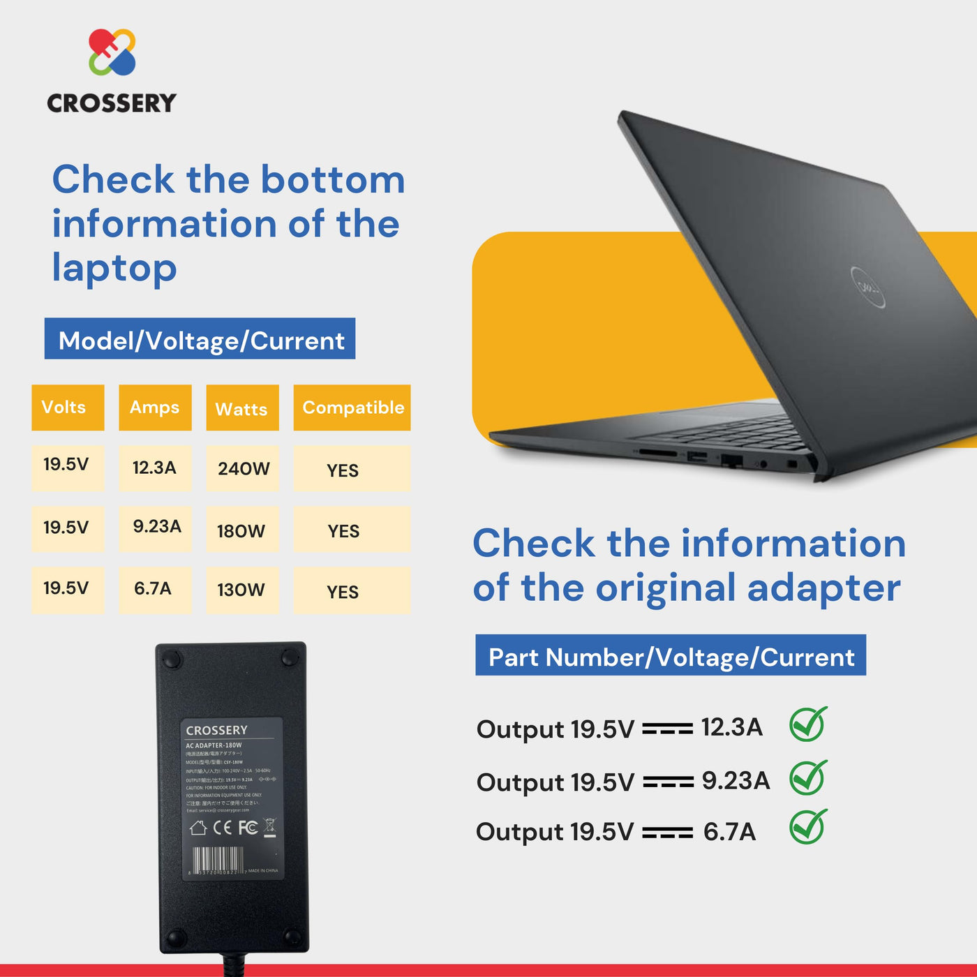 The New Crossery 180W Ac Adaptor For Dell Alienware Comes With 11 Feet Power Cord And Tested For Compatibility With Dell 180W 240W 130W Models, G Series, Precision Series , Inspiron Series Mentioned Below: Input: 100V-240V 50-60Hz Output: 19.5V 9.23A 180W Connecter Size: 7.4*5.0Mm Guarantees Flawless Compatibility With The Best Gaming Laptops. Dell Alienware 13, 13 R2; 13 R3 / 14; M14X P18G / 15 R2; 15 R3; 15 R4 R6 / 17: 17 R2; 17 R3; 17 R4; 17 R5 / Alpha: Asm100; Asm-R2 / M11X: M11X R2; M11X R3 / M15 / M17 / X51 R2 - Dell Gaming 15 G3 15 17 / G5 15 17 / G7: G3 3579; G3 3779 3590; G5 5587; G5 5590; G7 7588; G7 7590 And G7 7790. Beyond Supporting Skus 0Ww4Xy, 0Dw5G3, 0Jvf3V, 074X5J, 045G4G, This Laptop Charger Also Support Asus And Easily Runs Higher Clocking Models Including Inspiron 15 7000 Gaming Series 7577 ; 7559 ; 7566;7777 /74X5J Jvf3V Da180Pm111,Fa180Pm111 Adp-180Mb B P/N: Ndfty, 450-Agcu, 0N7Mww And N7Mww.