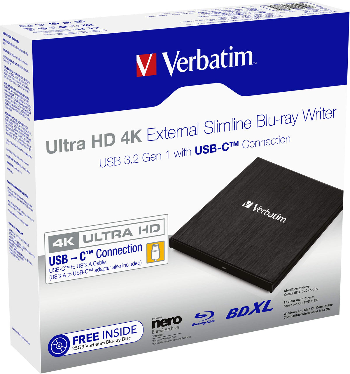 Q: What software is included with the Verbatim Ultra HD Blu-ray Writer?A: The product comes with award-winning Nero Burn and Archive software that includes features like DiscSpan, MediaHome, and SecureDisc Technology. Please note that this software is only suitable for PC users.