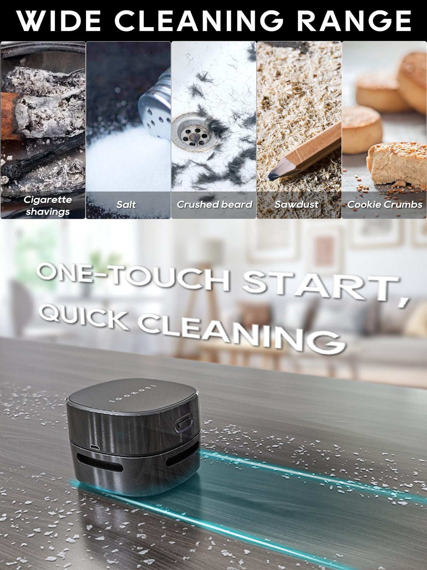 Q: What types of debris can the IGOKOTI Desk Vacuum Cleaner handle?A: The IGOKOTI Desk Vacuum Cleaner is capable of handling a variety of debris including dust, crumbs, rubber scurf, pet hair, and even fine particles like ash. It's perfect for quick clean-ups on tables, sofas, and in cars.