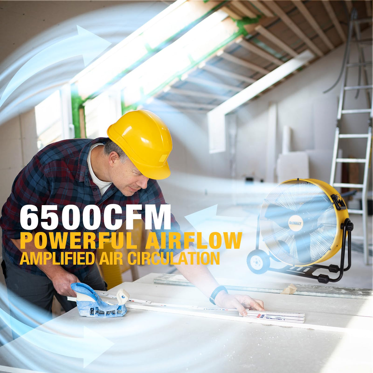 Q: How does the airflow of the DEWALT DXF2490 compare to other fans?A: The DEWALT DXF2490 delivers an impressive airflow of 6500 CFM at 1050 RPM, making it highly effective for cooling larger spaces compared to standard fans.