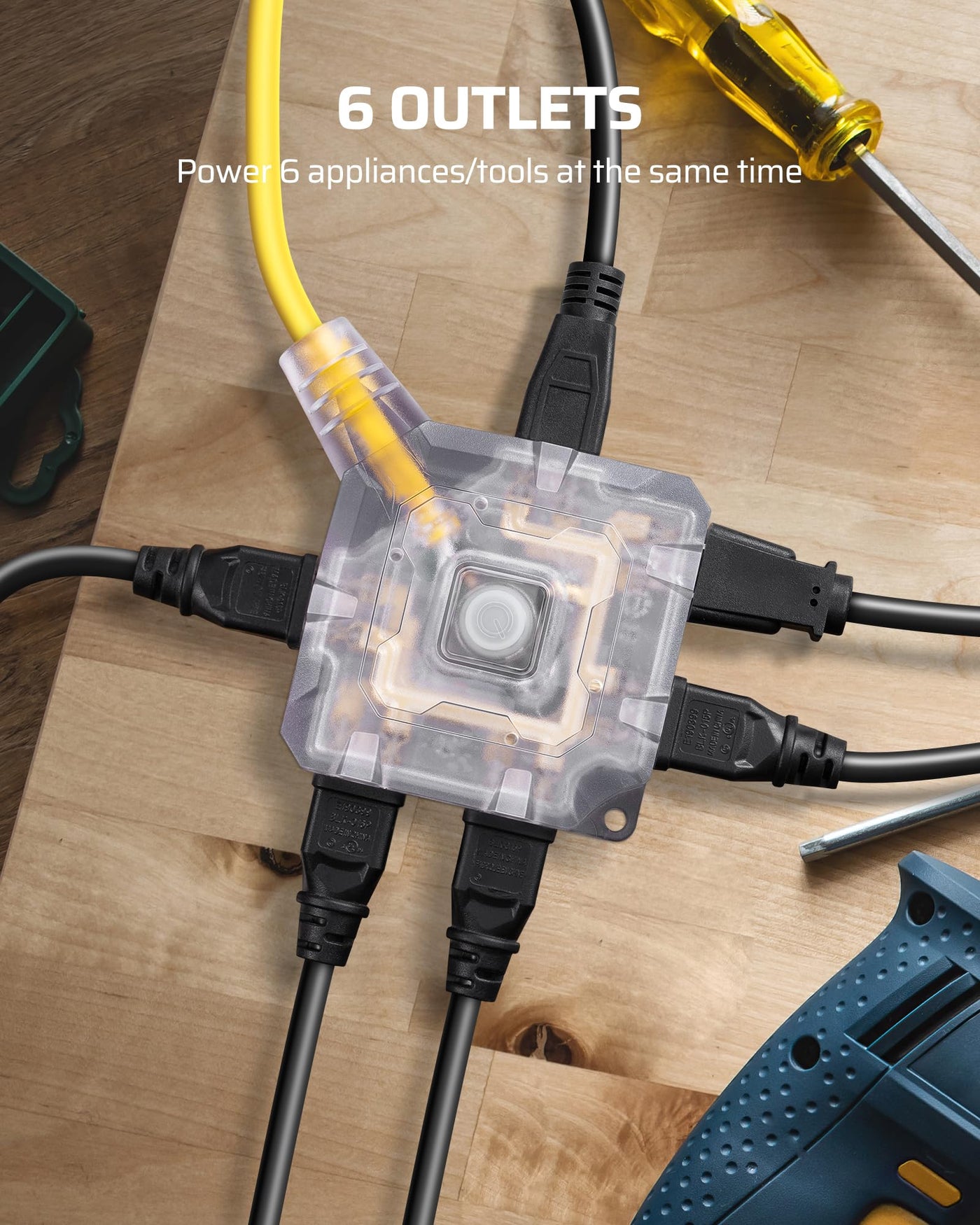 Q: How many outlets does the DEWENWILS extension cord have?A: The DEWENWILS 10FT Outdoor Extension Cord features 6 built-in outlets, allowing you to power multiple devices simultaneously without the hassle of swapping cords.
