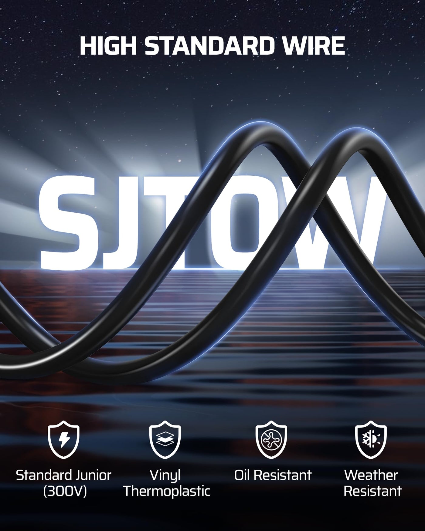 Q: Is the extension cord suitable for outdoor use?A: Yes, the 12AWG SJTOW heavy-duty power cord is designed to be oil and waterproof, making it suitable for outdoor use in various conditions.