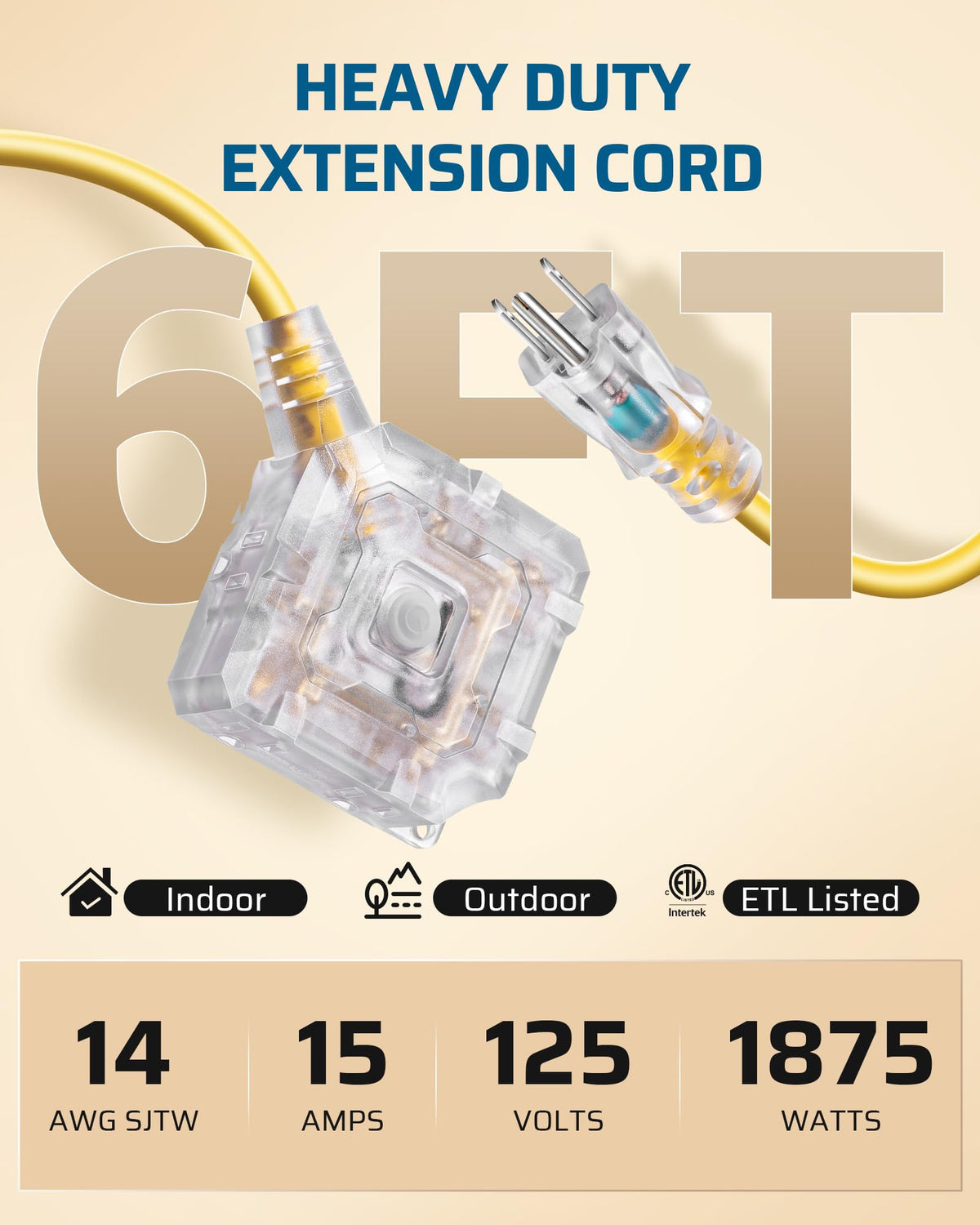 Introducing The Dewenwils 6Ft Outdoor Extension Cord, Your Ultimate Solution For Reliable And Weatherproof Power Supply Both Indoors And Outdoors! Heavy-Duty Construction: Constructed With High-Quality Materials, The Dewenwils 6Ft Outdoor Extension Cord Is Designed To Withstand The Rigors Of Outdoor Use. The Yellow Heavy-Duty Cord Features A 14 Awg Sjtw Weatherproof Power Cable, Ensuring Durability And Long-Lasting Performance In Various Weather Conditions. Multiple Outlets: With 6 Built-In Outlets, This Extension Cord Provides Ample Power Supply For Your Outdoor Devices And Equipment. From Garden Tools To Holiday Decorations, You Can Easily Connect Multiple Devices Without The Hassle Of Constantly Swapping Cords. The Lighted Outlets Also Indicate When The Power Is On, Adding Convenience And Safety To Your Setup. Weatherproof Design: Engineered For Outdoor Use, The Dewenwils Extension Cord Is Weatherproof And Suitable For Use In Rain, Snow, Or Sun. The Sjtw Weatherproof Power Cord Is Designed To Resist Moisture And Withstand Harsh Outdoor Elements, Ensuring Reliable Performance Year-Round. Specifications: -Input Voltage: 125Vac 60Hz -Max Power Rating: 15A 1875W -Length: 6Ft, 10Ft, 15Ft, 25Ft(Optional) -Cord: Sjtw 14/3C Packing List: - Extension Cord X 1