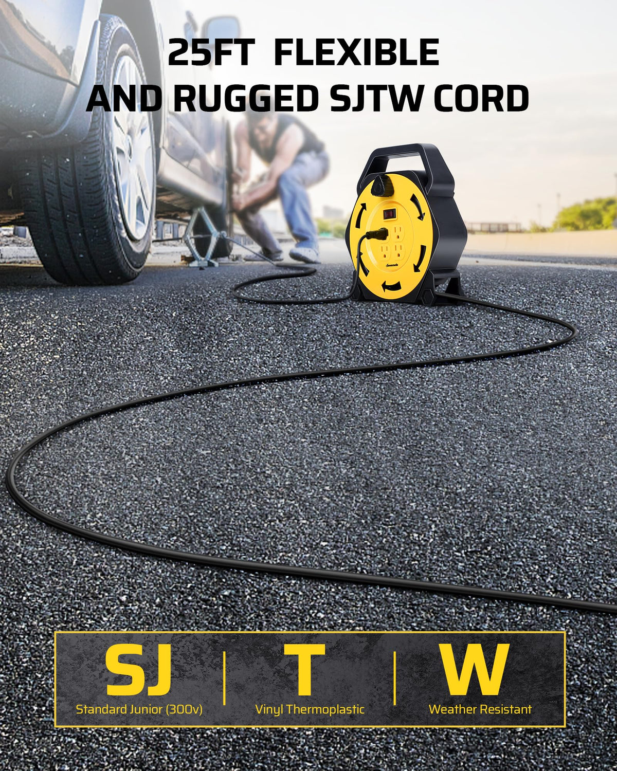 Dewenwils Extension Cord Reel With 25 Ft Power Cord, Hand Wind Retractable, 16/3 Awg Sjtw, 4 Grounded Outlets, 13 Amp Circuit Br