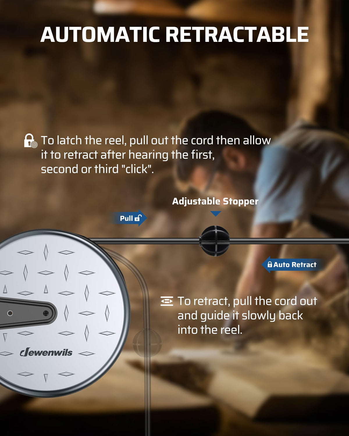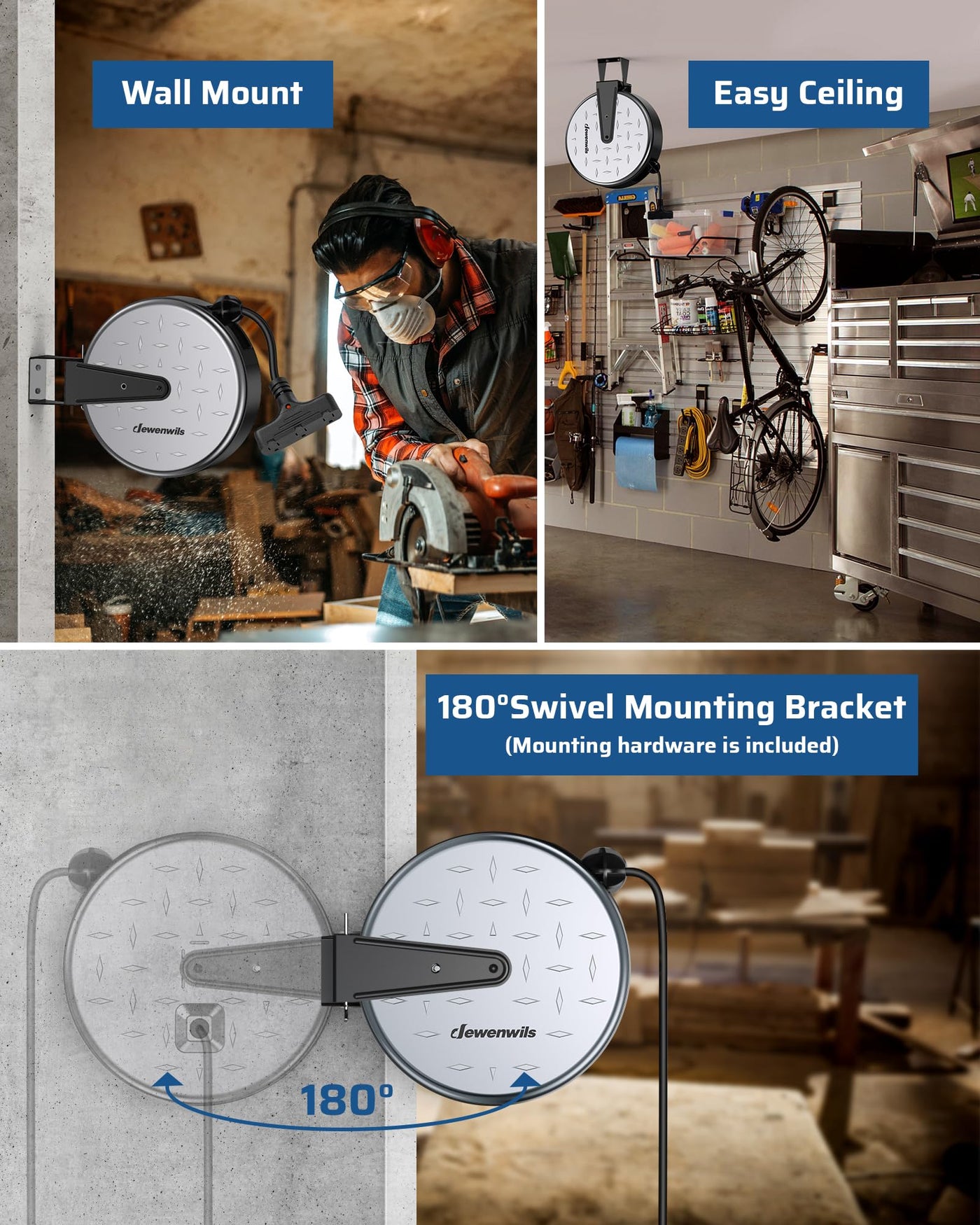 Dewenwils Metal Extension Cord Reel,30Ft Retractable Extension Cord, 16Awg/3C Sjtw Power Cord, 3 Electrical Outlets, 10A Circuit