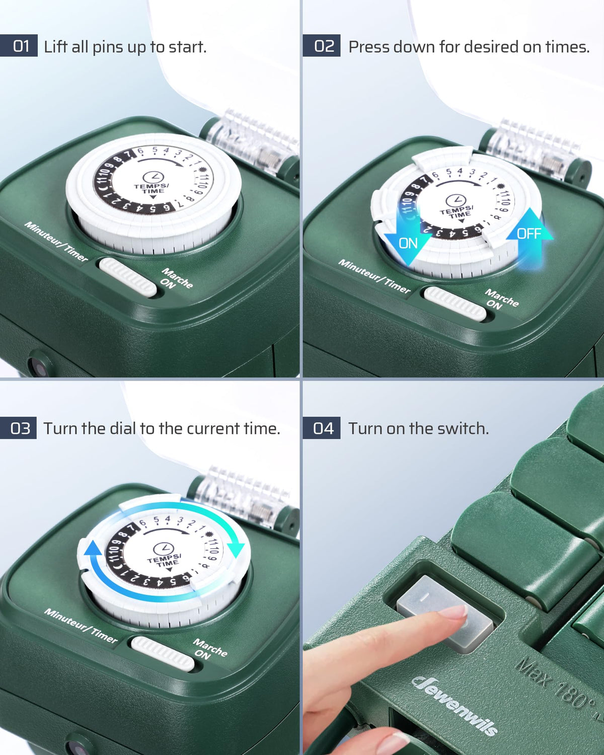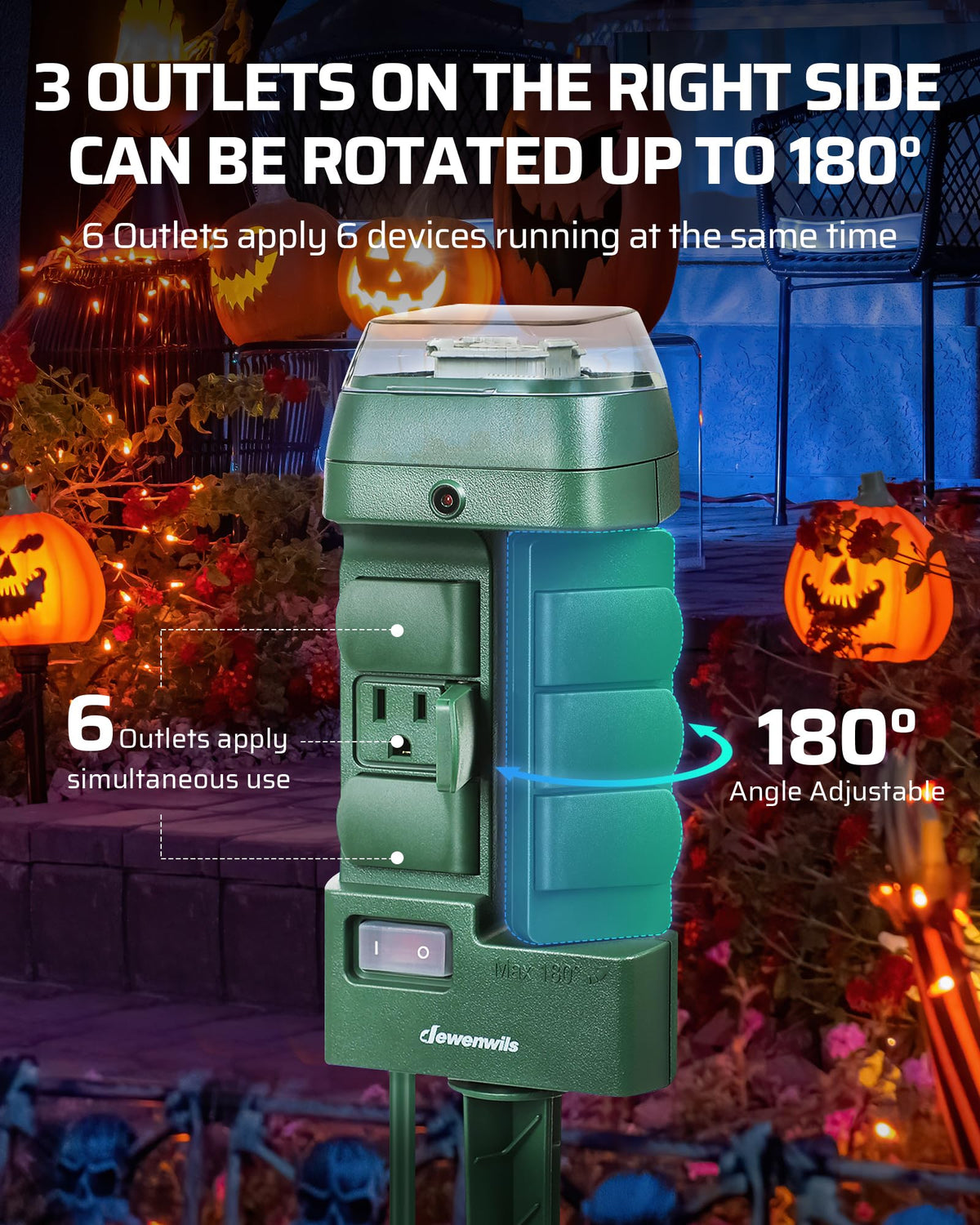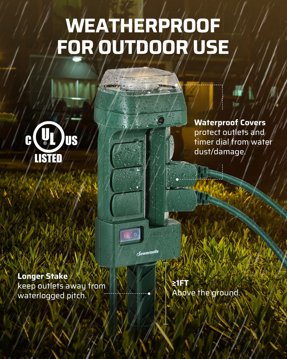Dewenwils Outdoor Mechanical Power Stake Timer, Waterproof, 6 Grounded Outlets(3 180Rotatable), 6Ft Cord, Yard Stake Outdoor Timer For Halloween/Christmas Lights, Yard, 1625W/13A, Ul Listed