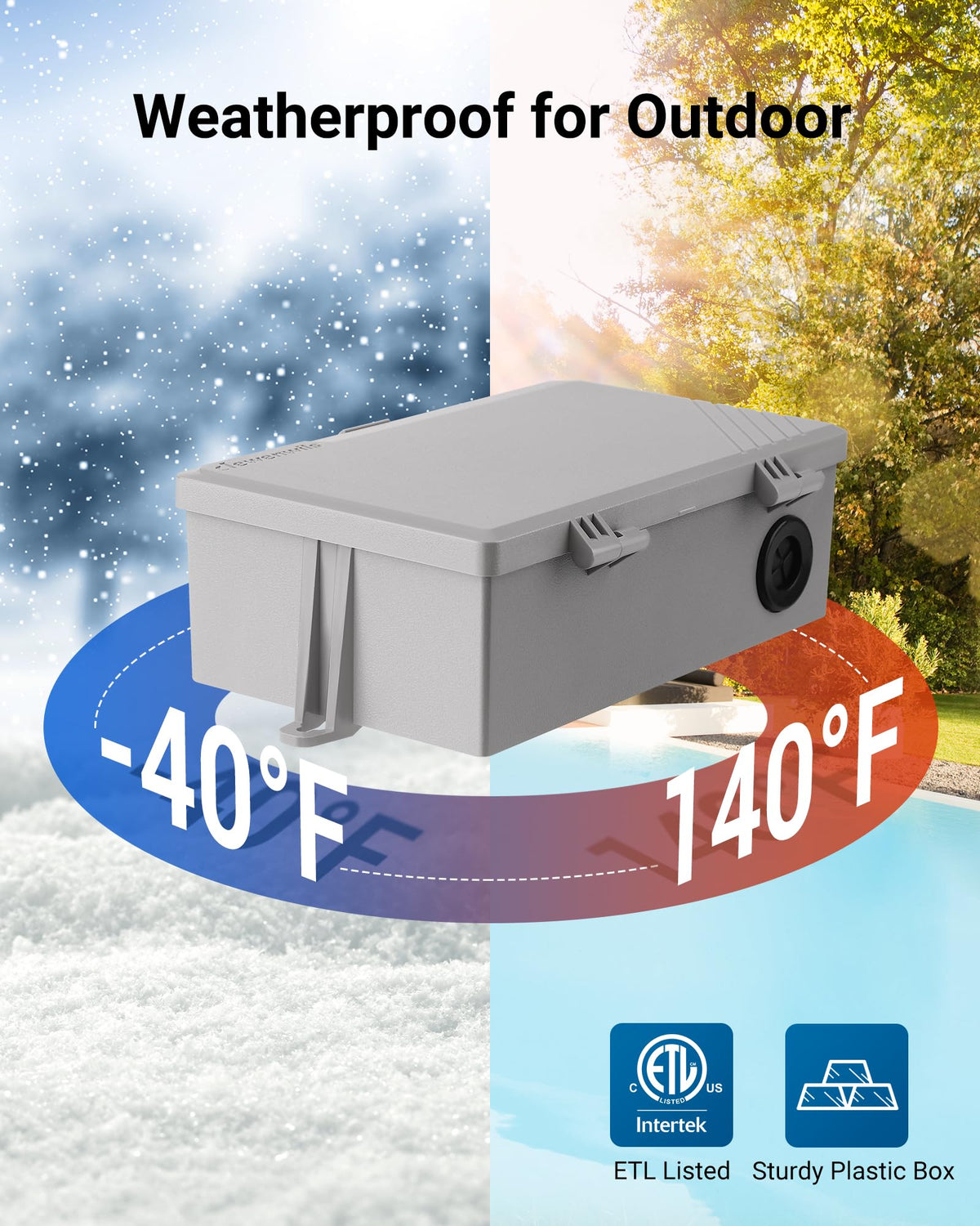 Q: Is the DEWENWILS Timer suitable for outdoor use?A: Yes, the DEWENWILS Pool Pump Timer is designed for both outdoor and indoor use. Its weather-resistant and durable housing can withstand UV exposure and high temperatures, making it ideal for managing outdoor equipment.