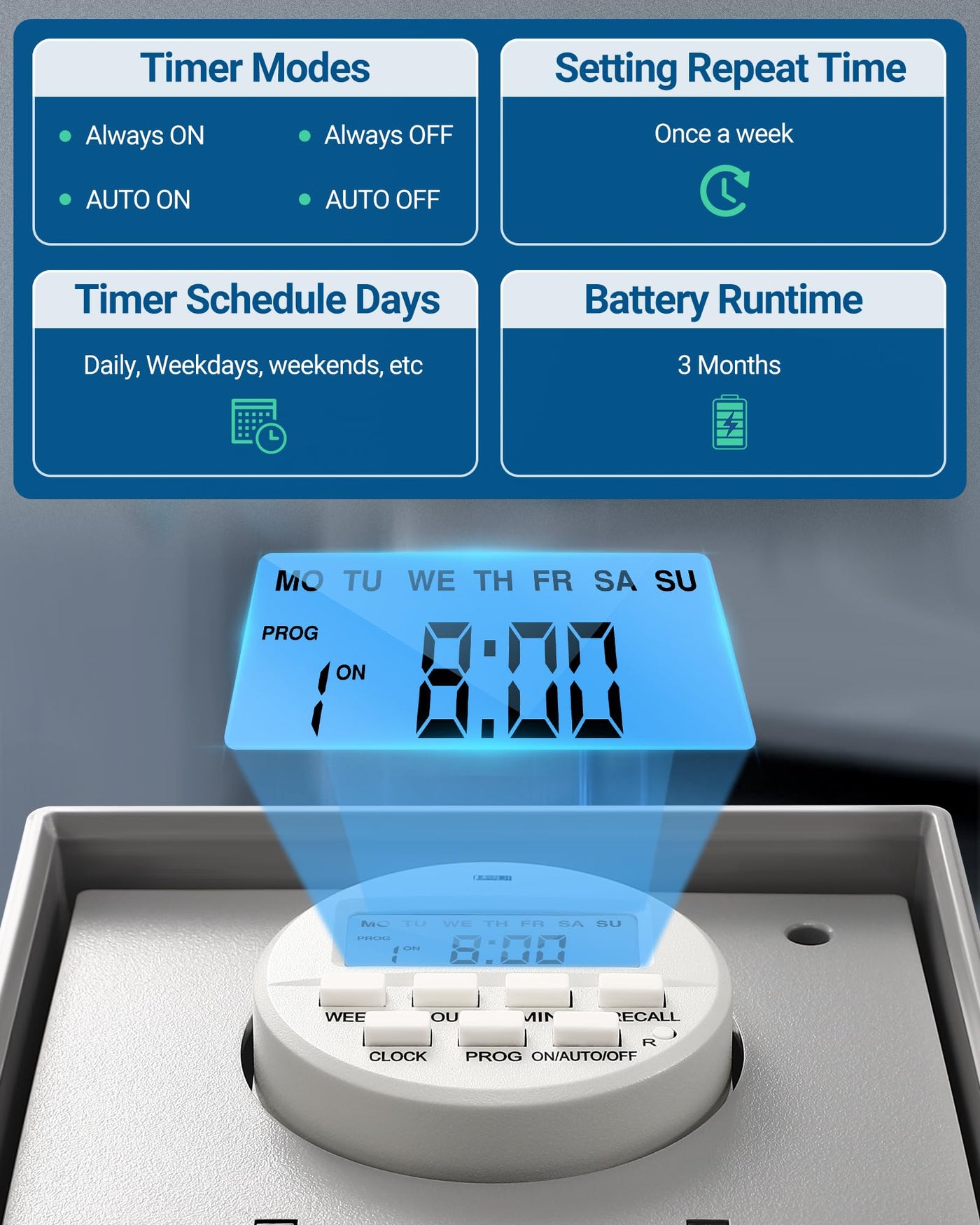 Q: What happens to my timer settings during a power outage?A: The DEWENWILS Pool Pump Timer features a built-in backup battery that retains your settings for up to 3 months during power failures, ensuring that you won't have to reprogram your timer after an outage.