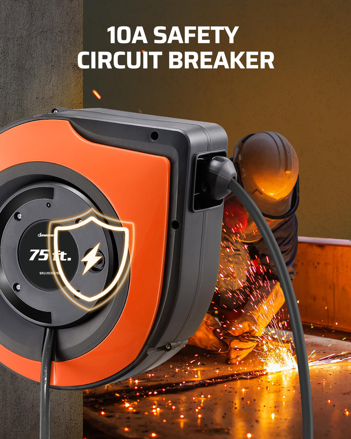 Dewenwils 75 Ft Retractable Extension Cord Reel Designed With A 14/3C Gauge Wire, Ensures A Reliable Flow Of Electricity, Suitable For Most Household And Industrial Use. With A Smart Auto-Guide Rewind Mechanism For Quick Retraction Without Kinks Or Tangles. Ratchet System For Easy Locking At Any Desired Length. Made From Durable Materials, No Breaking After Repeated Bending. Resistant To Uv Rays, Water, Oil, Acid And Harsh Weather.
