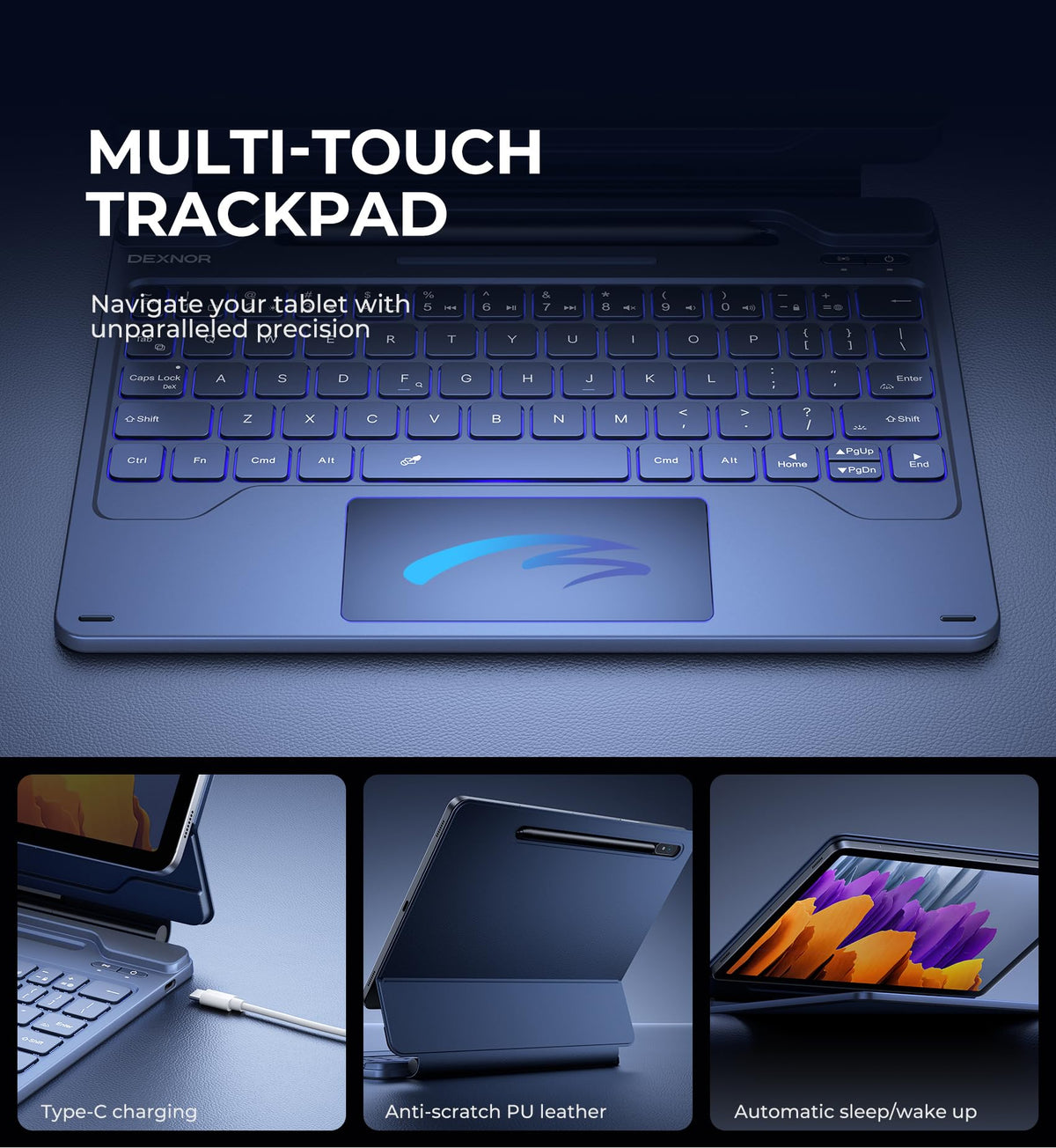 Q: What features does the Dexnor Keyboard Case offer for enhanced usability?A: This case includes a high-precision multi-touch trackpad that supports multi-finger gestures for easy navigation. Additionally, it has a sturdy aluminum alloy hinge that allows for seamless adjustments of viewing angles, turning your tablet into a laptop-like experience.