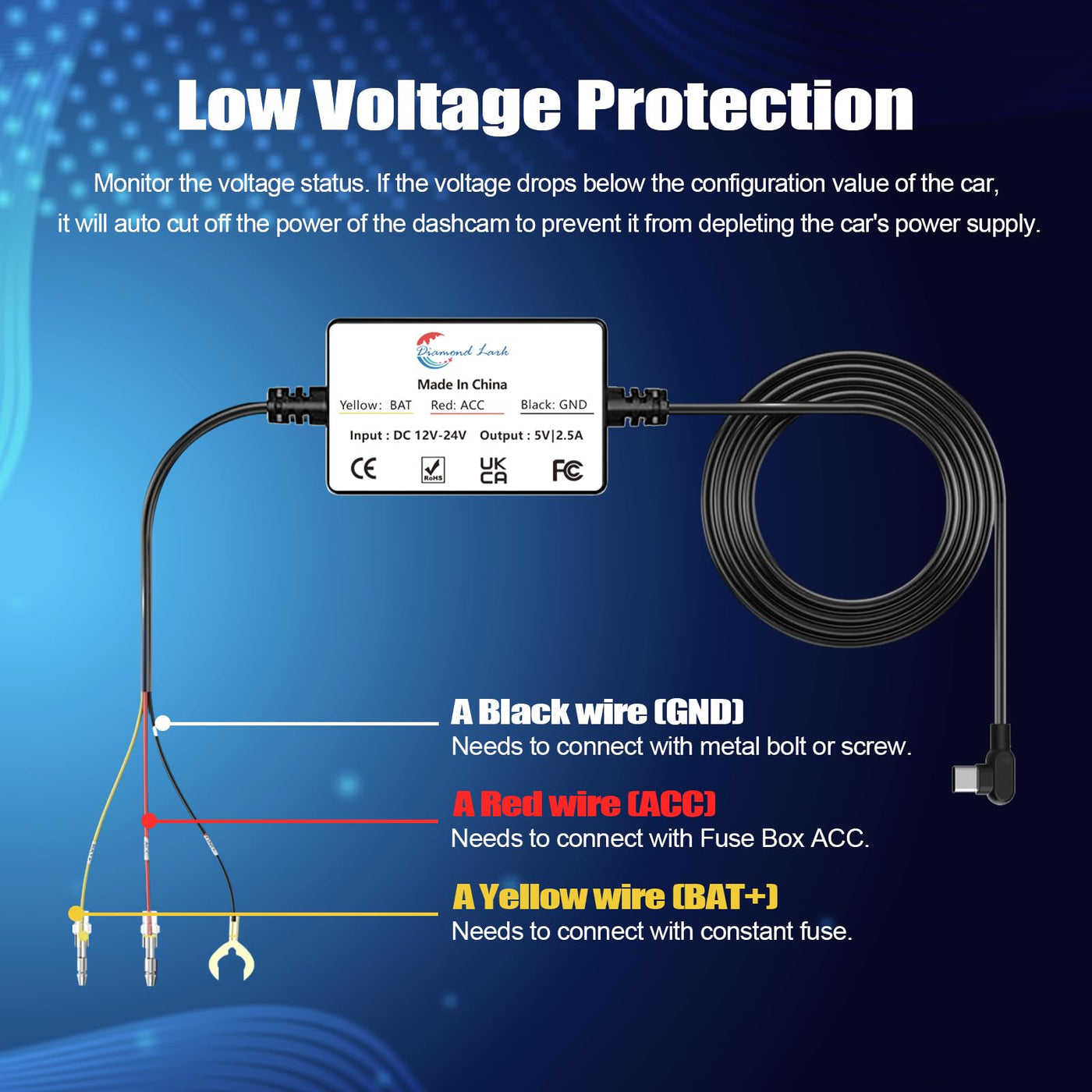 Diamond Lark Hardwire Kit For Dash Cam Is A Power Supply Cable Specifically Designed For Dashcam. It Lowers The Vehicle'S Power Supply Voltage To Provide Stable And Reliable Power Support To The Dash Camera, Ensuring Its Proper Functioning And Recording Of Crucial Information During Your Journeys. It Unlocks The Car Dash Cam'S Parking Monitoring Feature, Offering Continuous Protection For Your Vehicle 24/7.