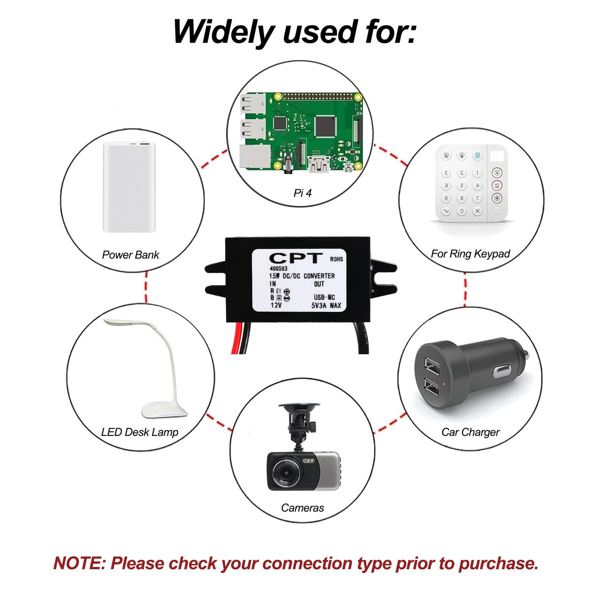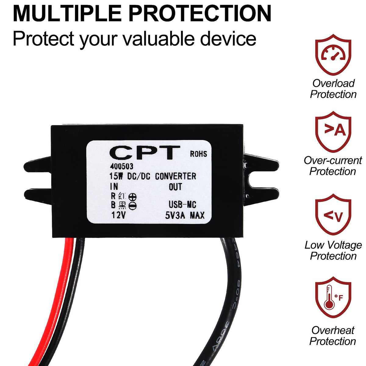 Q: What devices can I power using this 12V to 5V converter?A: This DC to DC converter is suitable for various devices including car LED displays, GPS navigation systems, driving recorders, electronic dogs, car radios, MP3/MP4 players, and surveillance systems.