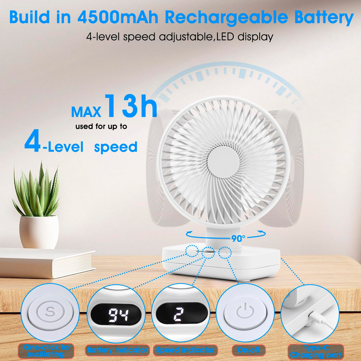 We Have Researched 9 Hot-Selling Oscillating Fans On The Market, And After A Year And Four Months Of Development, We Finally Launched This Unique Small Oscillating Fan. We Have Made Comprehensive Upgrades, Including Increasing The Battery Capacity To 4500Mah, Adding Led Power And Mode Display, Reducing The Size Of The Mini Oscillating Fan For Better Portability, Adding Wall Mounting Holes, And Most Importantly, Upgrading To A Brushless Motor To Make The Desk Fan Quieter. We Have Also Redesigned The Table Fan Blades To 3 Blades, Increasing The Usb Fan Speed And Creating A Turbine Effect For Better Airflow Circulation, Hence Improving Cooling Efficiency.