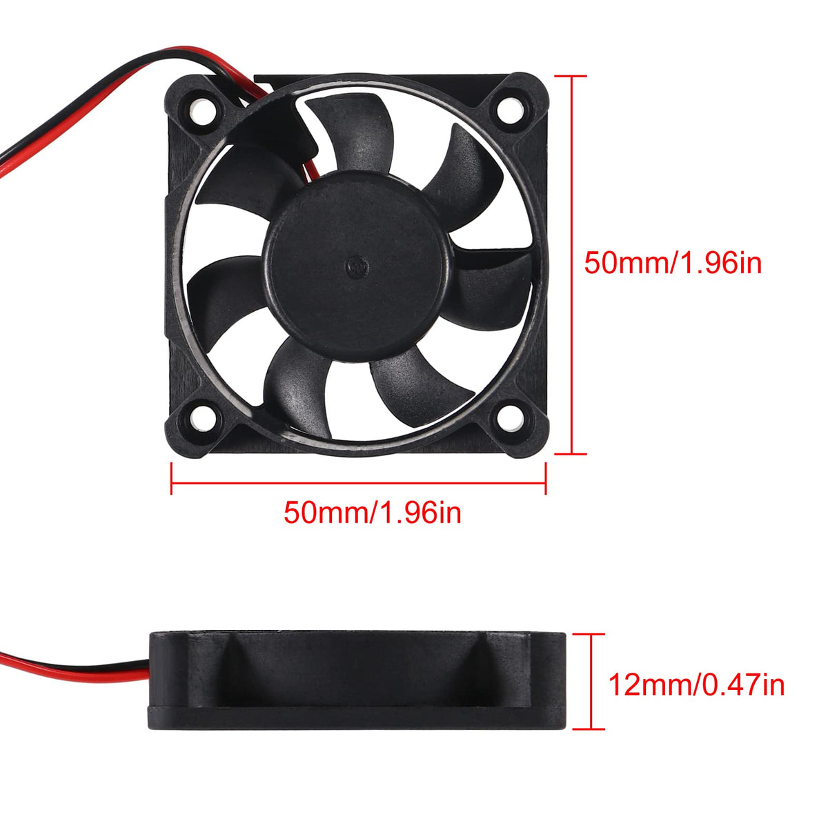 Specifications:Working Voltage: Dc 12Vworking Current: 0.1Aair Flow: 9.95Cfmspeed: 300010% Rpmnoise: 28.5Dbafan Size: 50 X 50 X 12Mm/1.97 X 1.97 X 0.47Inch(L*W*T) Package Include:4Pcs 50X50X10Mm Cooling Fans