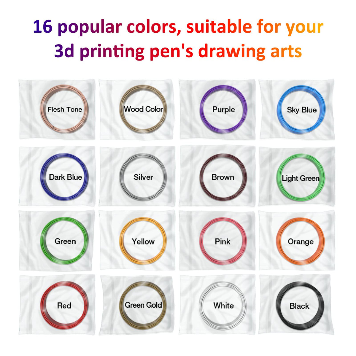 Q: How many colors are included in the 3D pen filament kit?A: The kit includes 16 different colors of PLA filament, with each color providing 40 feet of material for a total of 640 feet.