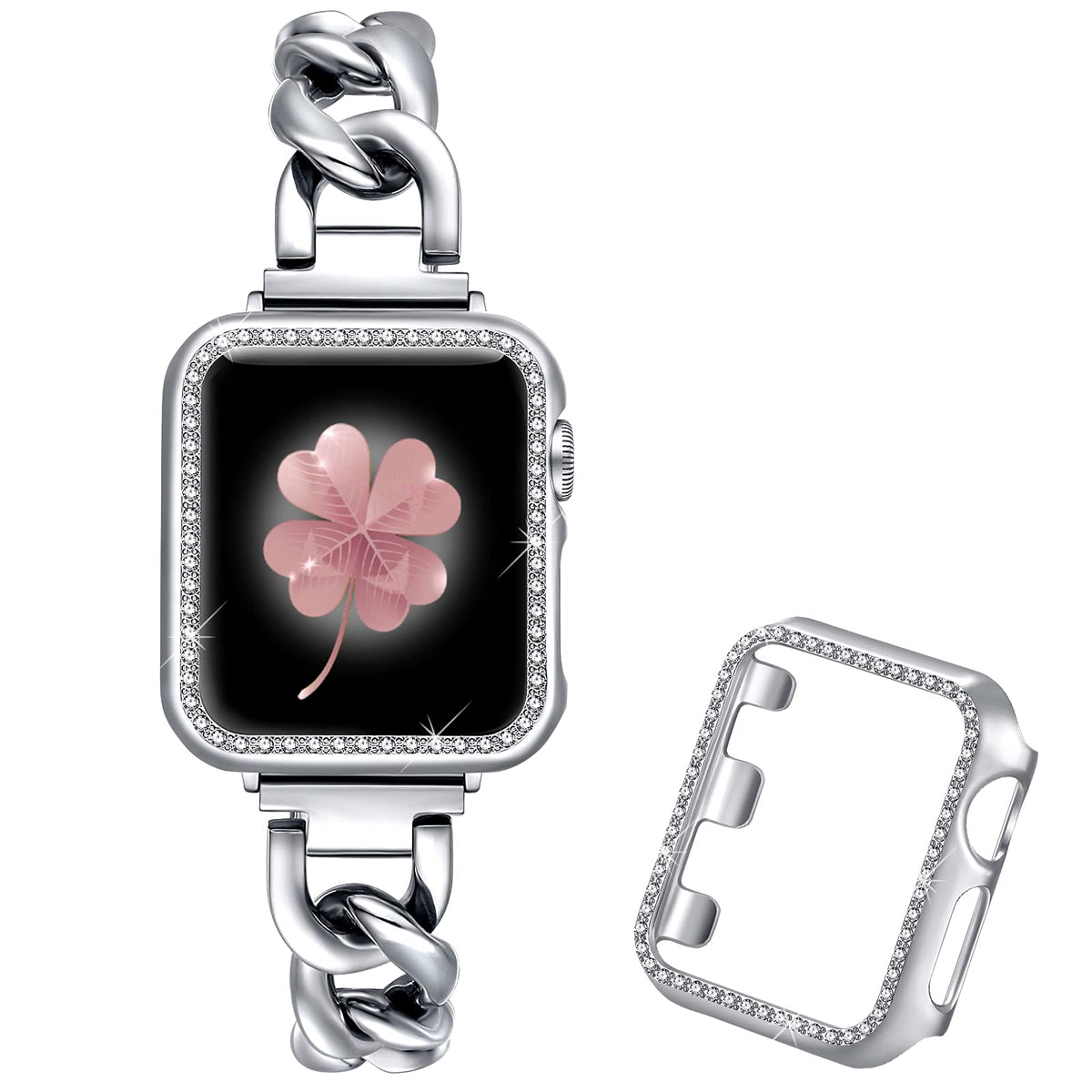 Dilando, We Devote Ourselves To Transform Your Apple Watch Iwatch From A Tech Gadget Into A Cute Fashion Jewelry Accessory You Will Love, To Be More Dressy&Classy Cowboy Link Band For Apple Watch With Bling Case, We Make You Dressy More This Chunky Chain Link Jewelry Apple Watch Band With Bling Sparkle Bumper Case Is Full Of Diamondsrhinestones And With Adjustable Cow Chains For Easy Size Adjustment, Suitable For Any Wrist Size Between 55Inch To 82Inch And Fits For Apple Watch Band Series Se And 6 5 4 3 2 1 This Metal Band For Apple Watch Is Made Of Stainless Steel Metal Nickle Free With Durable Ion Plating To Withstand Moisture And Abrasion And The Adaptor Is Also Stainless Steel To Be Sturdy And Durable To Protect Your Apple Watch Easy Size Adjustment, No Tools Needed This Cute Metal Chain Band Adopts 6 Folding Clasps To Make You Easily Remove Extra Links For The Watch Band To Fits Your Wrist Easily And Quickly Bling Sparkle Protective Watch Case This Bling Case Full Of Diamonds Rhinestones Are With Precise Cutouts For Functional Buttons And Ports, And It Is Easy To Snap On And Take Off Without Affecting The Band Insertion Or Watch Charging Also It Can Full Protect The Watch From Scratch, Bumps And Accidental Drops Rich Color And Size Variation We Have Silver, Gold, Rose Gold, Black Available For You To Choose And Also Kindly Choose 38Mm 40Mm 42Mm 44Mm According To Your Apple Watch