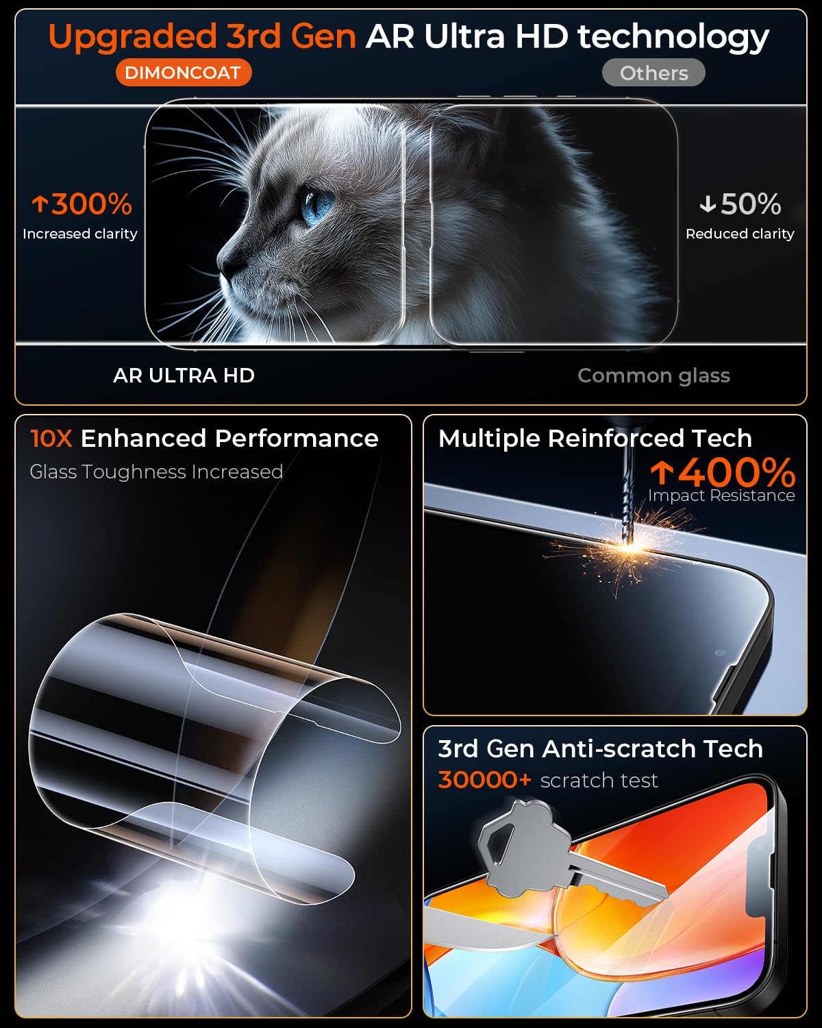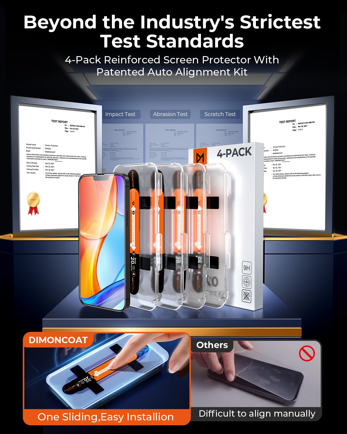 Q: What level of protection does the tempered glass provide?A: The DIMONCOAT tempered glass screen protector offers 10X military-grade protection, with hardness rated up to 9H. It effectively shields your device from scratches, scuffs, and impacts.