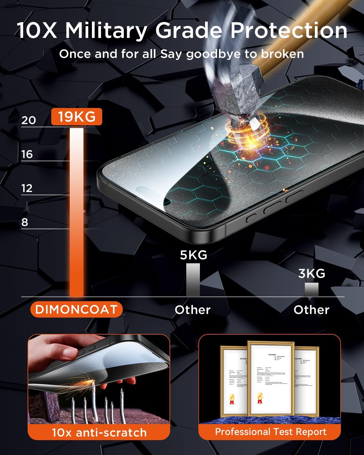 Q: What makes the DIMONCOAT 4-PACK Screen Protector different from other brands?A: The DIMONCOAT 4-PACK Screen Protector features top-quality tempered glass that is twice as strong as other brands. It utilizes an innovative Auto Alignment Kit for easy installation and offers 10X military-grade protection, ensuring superior impact resistance and durability.
