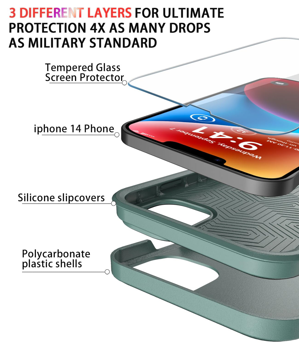 Diverbox For Iphone 14 Case [Shockproof] [Dropproof] [Tempered Glass Screen Protector ],Heavy Duty Protection Phone Case Cover F