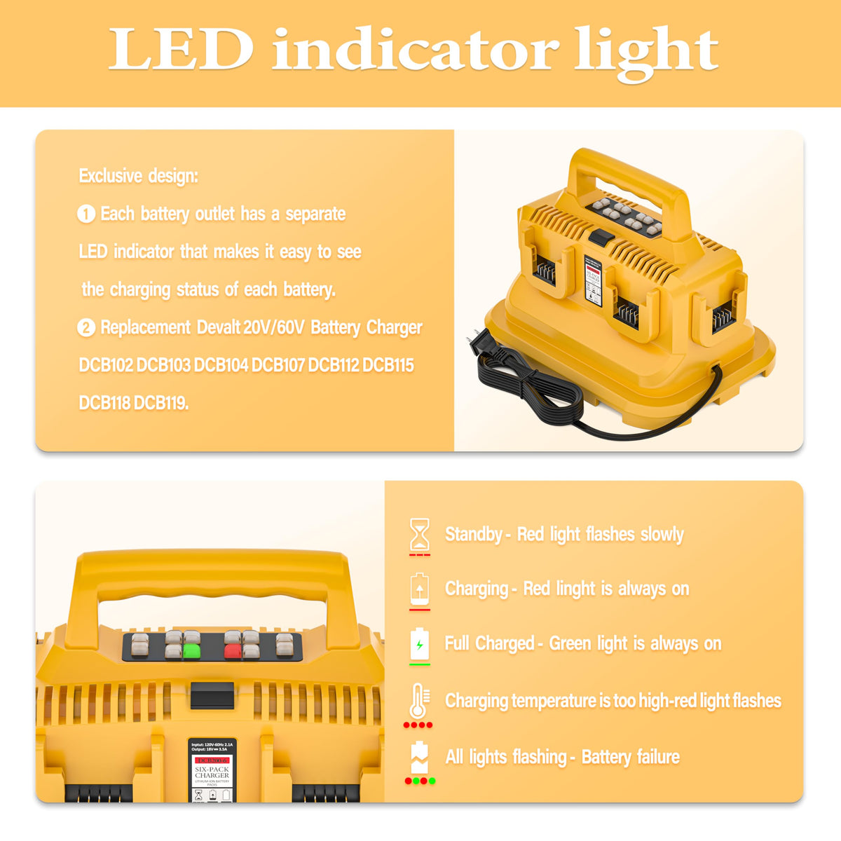 Dmmns Replacement For The Devvalt Battery Charger Is A 6-In-1 Charging Station.Each Charging Port Is Equipped With An Led Indicator, Allowing You To Easily Monitor The Battery Charging Status. This Charger Serves As An Excellent Alternative To The Devvalt 20V Fast Chargers Such As Dcb102 And Dcb104. It Charges The Batteries At A Satisfactory Speed And Performs Just As Well As The Original Equipment Manufacturer (Oem) Model. Dmmns Dcb200-6 6-Ports Replacement Rapid Charger For Devvalt 20V/60V Battery Charger Station: Item Specification: 6-Ports Sequential Fast Charger Input: Ac100V-240V 50/60Hz Output: Dc21V 3A Replacement For Devvalt 20V/60V Battery Charger,Six Port Lithium-Ion Charger Compatible With Devvalt 20V/60V Battery: 20V:Dcb200 Dcb201 Dcb203 Dcb204 Dcb205 Dcb206 60V:Dcb606 Dcb612 Dcb606-2 Dcb609 Dcb609-2 Dcb612 Dcb615 Dcbp034-2