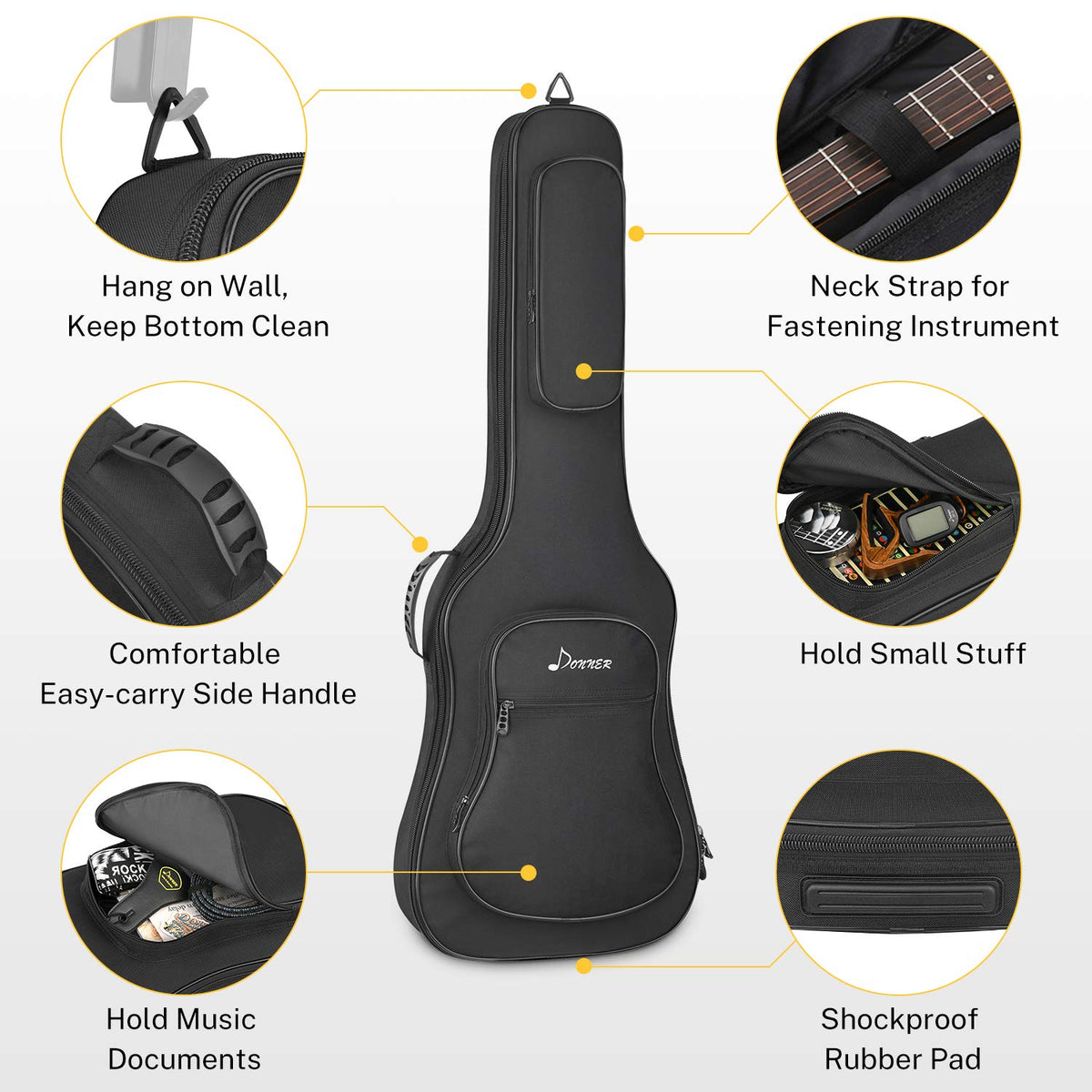 The Donner 39 Inch Premium Electric Guitar Gig Bag Based On Guitar Physical Structure To Design, Suitable For All Electric Guitar Size Below 39 Inch. Made Of 600D Wearable Oxford Material And Waterproof Nonwovens Interior Fabric, Has Better Lifespan Than Other Guitar Bag In The Market. 12Mm Sponge Padded To Protect The Guitar From Shock, Collision And Damage During Transportation. Large Capacity Two Front Pockets Can Easily Store Daily Things. The Large Front Pocket Is Used To Hold Music Documents And An Extra Neck Pocket For Small Items, Such As Cd, Strings, Cables, Capo, Tuner Etc. The Gig Bag Is Equipped With Two-Way Metal Zippers Of High Quality, It Slide Very Smoothly, Not Easily Get Stuck Or Break In The Process Of Slide. The Guitar Gig Bag Is Equipped With Two Adjustable Shoulder Strap And A Padded Carry Handle, To Ensure It Easily Carry And Convenient To Use. Specifications Color: Black Exterior Material: Superior 600D Oxford Interior Fabric: Waterproof Nonwovens Interior Protection: Thicken 12Mm Sponge Pad Shoulder Strap: Two Adjustable Straps Carry Handle: Thicken Sponge Handle Zipper: Two-Way Zipper Material: Nylon Oxford+Sponge Suitable For: 39 Inch Electric Guitar Net Weight: 850G 1.87Pounds Package Included: 1 X Donner Electric Guitar Gig Bag