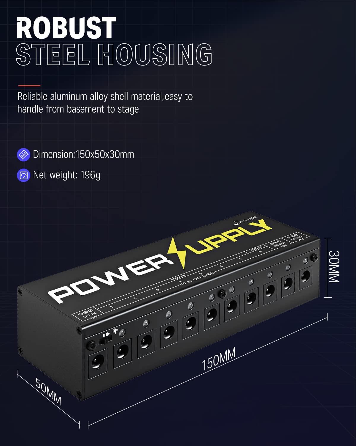Specifications: Material: Aluminum Alloy, Light Weight And Portable. Power: Ac 100V-240V. Input: Dc 18V. Output: --7 Way 9V 100Ma. --1 Way 9V 500Ma. --1 Way 12V 100Ma. --1 Way18V 100Ma. Dimension: 150 X 50X 30Mm. Net Weight: 196G. Color: Black. Short-Circuit Protection All 10 Outputs In This Unit Have Separate Short-Circuit Protection, I.E. Short Circuit In One Channel Won'T Affect Other Channels' Function. Under The Circumstances Of All Led Lights On, Led Light Of The Short-Circuited Channel Will Off, While Lights In The Other Normal Channels Are Still On. This Helps Locating The Faults When There Were Short Circuits Among Many Effectors. Attention: Incorrect Polarity Would Damage This Unit, Please Make Sure Correct Positive And Negative Polar Before Wiring. Package Included: 1 X Donner Dp-1 Supply. 1 X Power Adapter. 10 X Dc Power Cable. 2 X Polarity Reversal Cable. 1 X User Manual.