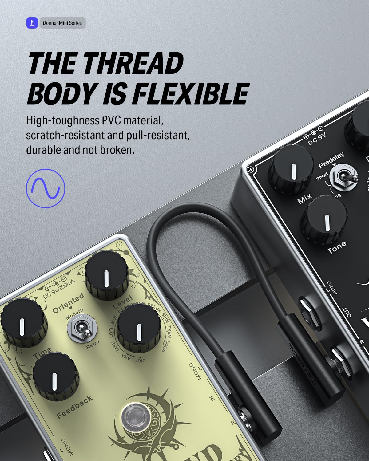 Q: What are the benefits of using Donner Flat Patch Cables for my pedalboard?A: Donner Flat Patch Cables are designed to save space on your pedalboard while providing flexibility and maintaining a clean setup. Their flat design reduces the risk of cable jams, and they feature ultra-low capacitance for crystal clear sound transmission.