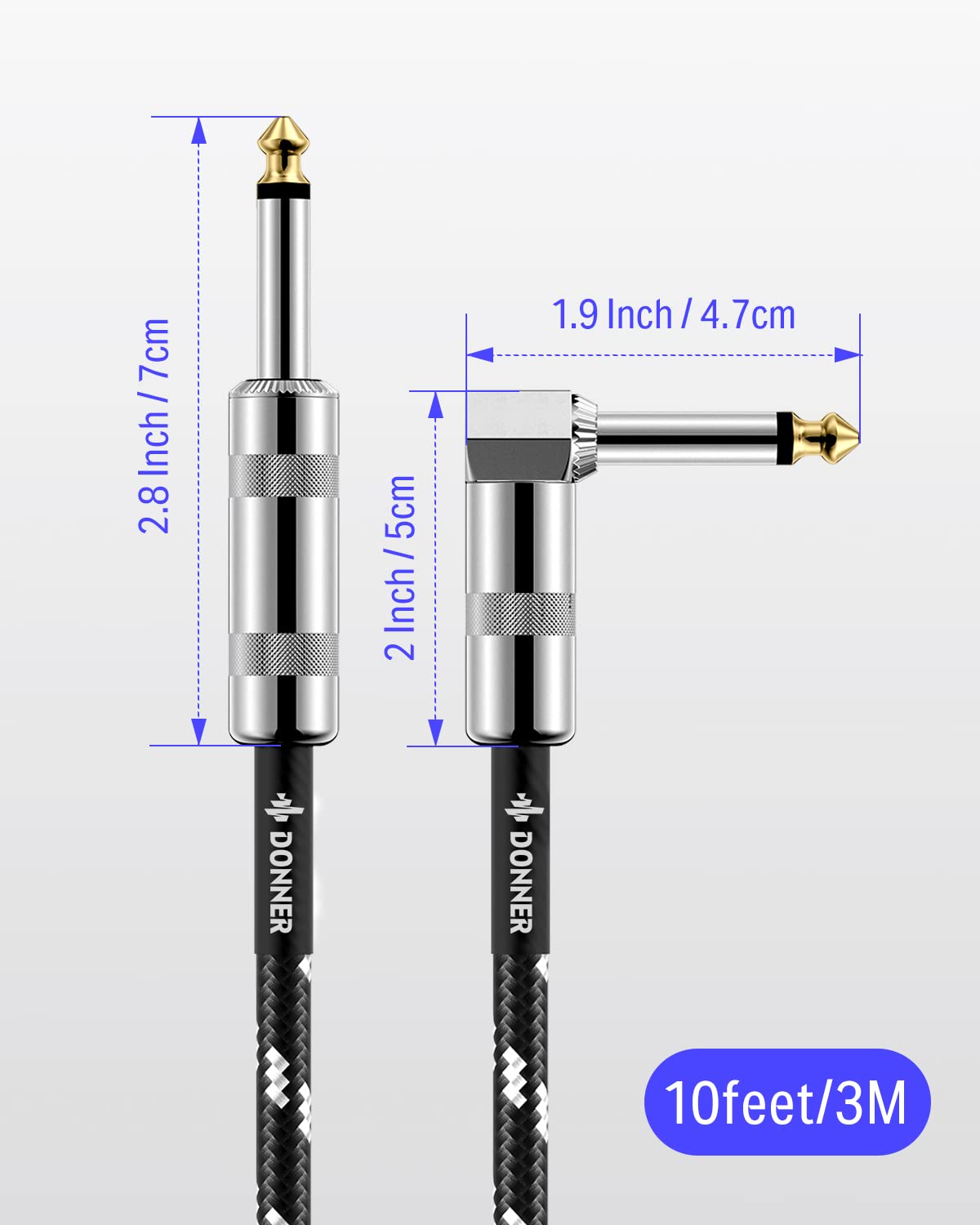 Q: How does the cable's length affect its performance?A: The Donner Guitar Cable is 10 feet long, which is optimal for medium runs like connecting a guitar to a pedal board or amplifier. Cables longer than 18.5 feet may experience signal loss; hence, the 10-foot length is designed to minimize any potential interference.