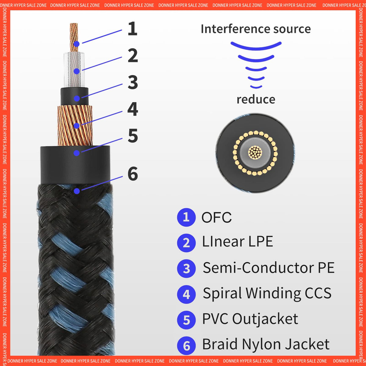 Q: What makes the Donner Guitar Cable suitable for high-fidelity audio?A: The Donner Guitar Cable features 24AWG oxygen-free copper center conductors that enhance signal transfer, ensuring that your audio maintains high fidelity without interference.