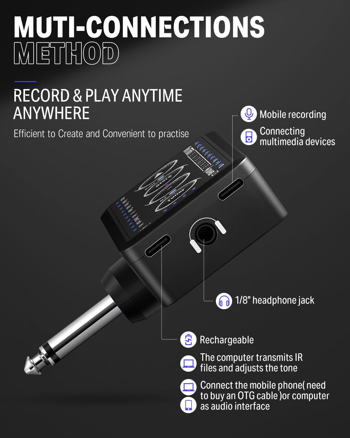 Donner Guitar Headphone Amp, Mini Turbo Headphone Amplifier Guitar, 10 Amp Models With Tuner, Inlay Multi Effects Delay Reverb Chorus Overdrive, Usb Export Bluetooth Function.