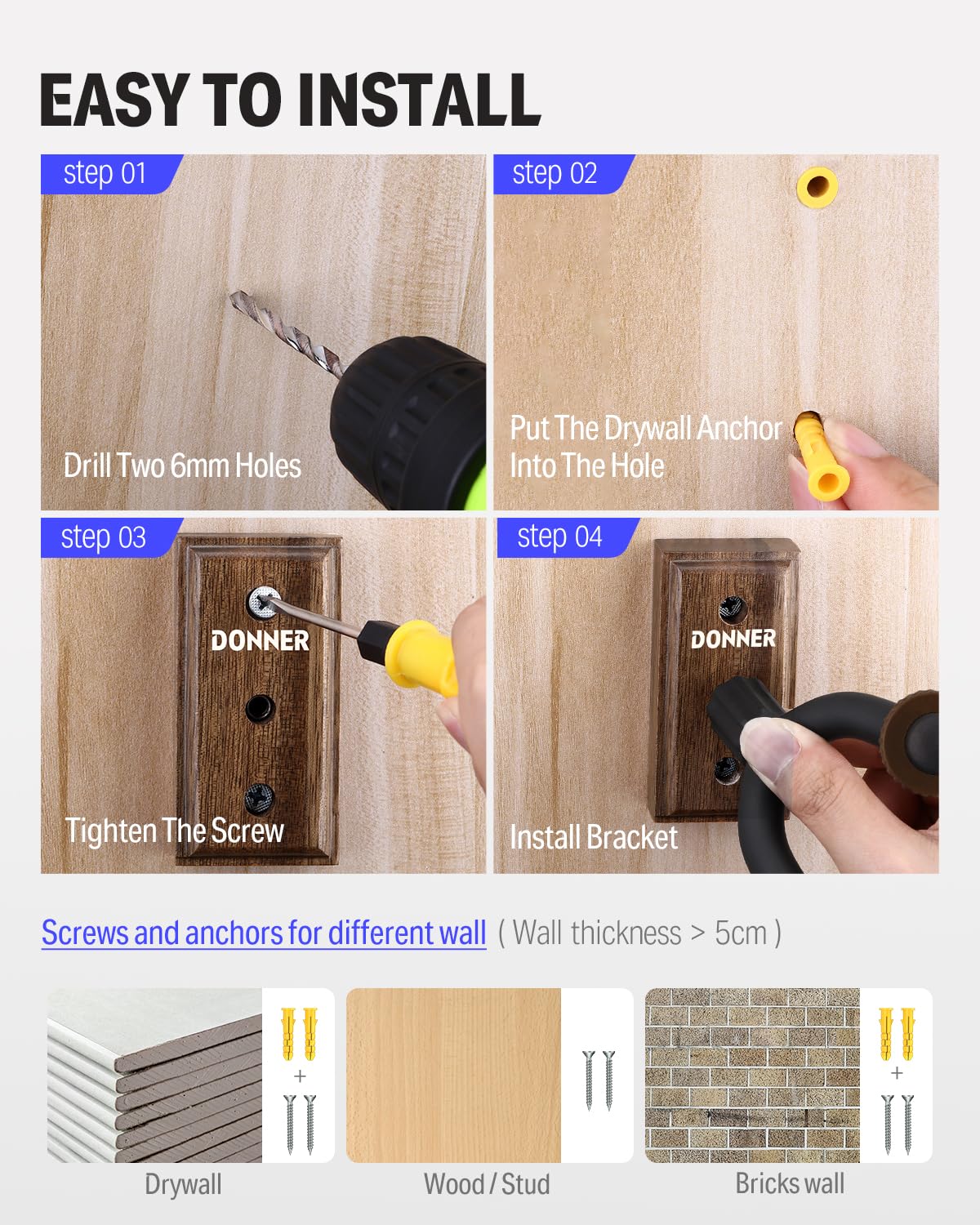 Descriptionthe Donner Wall Hangers Base Are Made Of High-End Black Walnut Wood After Polishing, The Surface Is Smooth And The Hand Feel Is Excellent, And The Curved Wood Grain On The Surface Can Quickly Attract Others Eye The Darkabrownawall Hangers Base With Black Rubber Sleeve Have A Retro And Elegant Feeling, Which Elevates The Guitar Level The Curved Edge Of The Wall Mount Base Not Only Prevents Cuts But Also Makes It More Elegant The Rubber Ring Can Be Adjusted To The Right Position According To Your Guitar Type To Ensure That The Guitar Does Not Slip Off Rubber Covers Keep Your Guitar From Getting Scratched Strong Metal Steel Can Bear Enough Weight And Is Very Durablespecificationscolors : Blackmaterial : Black Walnutapplication : Guitar, Bass, Banjo, Mandolin, Ukulelearm Length: 75Mm ( 295 Inch )Load Capacity: 10Kg (22Lbs)Size : 95 * 145 * 85Mm (37 * 57 * 33 Inch)Net Weight : 148 Gpackage Included6 X Donner Guitar Wall Mount Hanger12 X Screws12 X Drywall Anchors