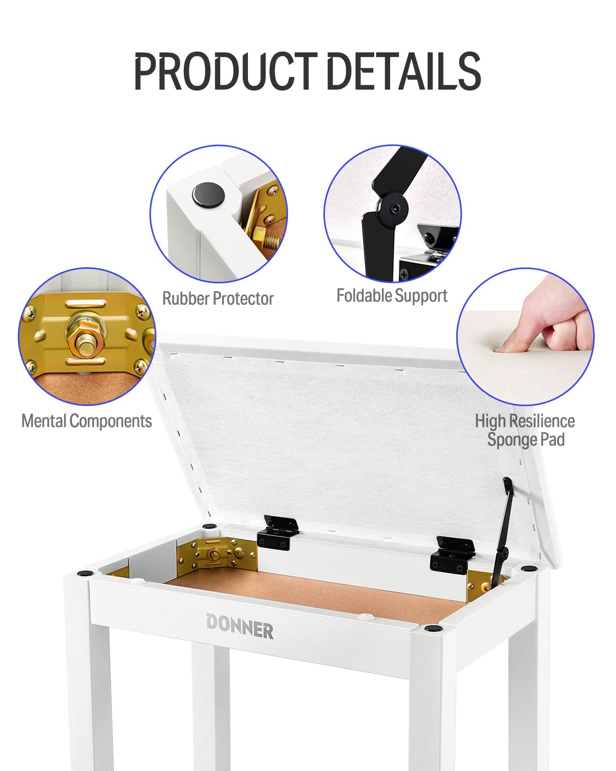 Donner Piano Bench With Storage, Solid Wood Keyboard Bench Piano Bookcase Stool Chair Seat With High Density Suede Cushion, Whit