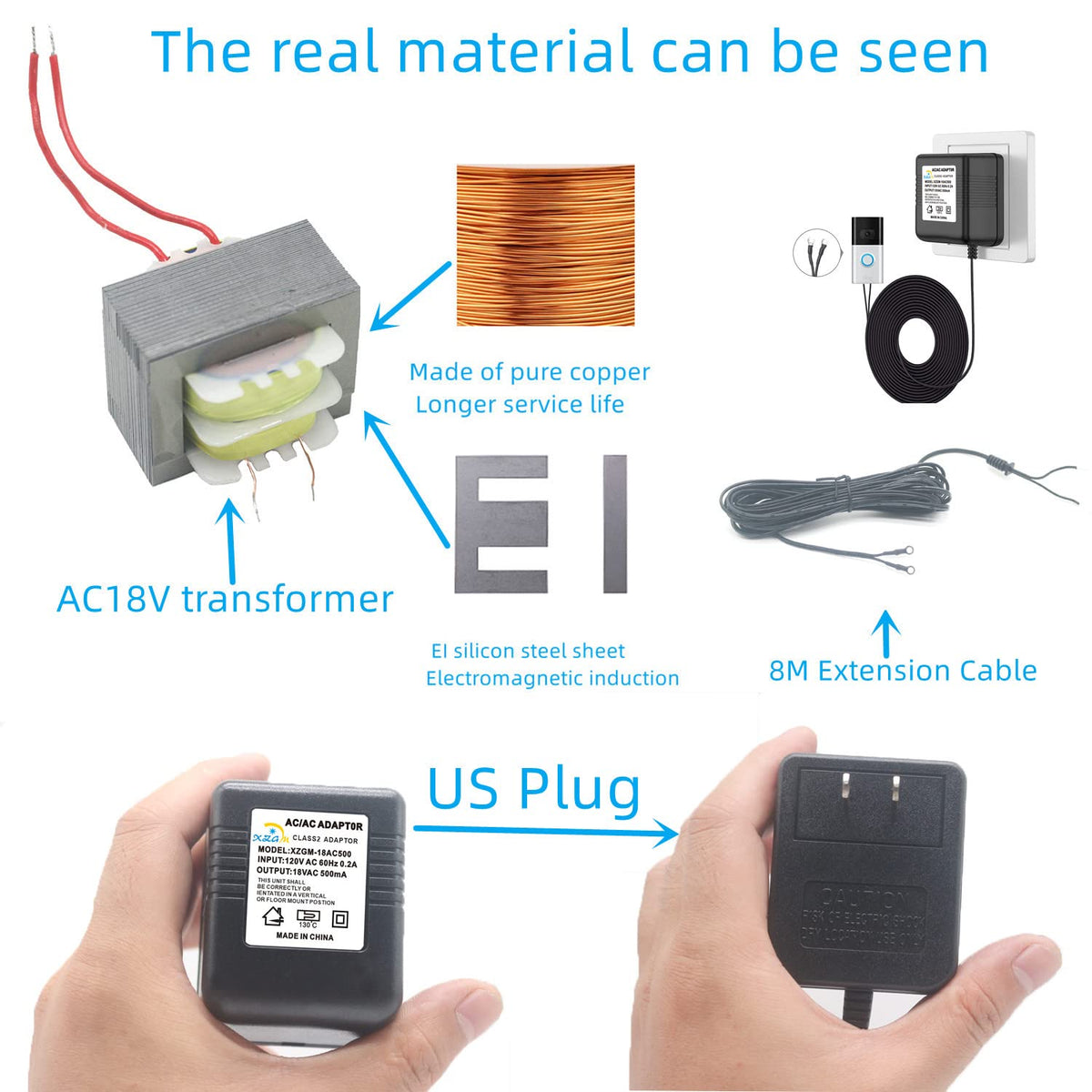 Q: What are the main features of the Doorbell Power Adapter 18V500MA?A: The Doorbell Power Adapter 18V500MA features a stable 24V output, a fireproof PC housing, a US pure copper plug for durability, and comes with an 8M extension cable for flexible placement. It is designed to eliminate noise during operation, ensuring your video doorbell functions effectively.