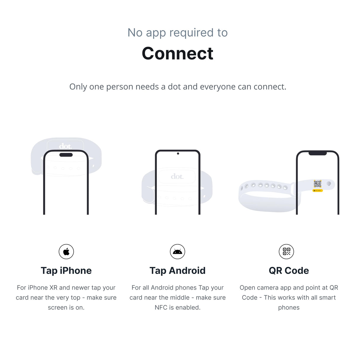 Introducing The Dot.Band - The Ultimate Networking Tool Upgrade Your Networking Game With The Dot.Band, A Revolutionary Solution That Redefines The Concept Of Business Cards. With Its Premium Silicon Finish And Weighty, Soft-To-Touch Design, The Dot.Band Offers A Superior Networking Experience Like No Other.&Nbsp;Features:- Wide Scanning Capability: Ensures Seamless Connections With Every Smartphone. - Unique Qr Code: Guarantees Foolproof Compatibility For Effortless Sharing.- Tap To Share: Share Dot.Profile With A Simple Tap Or Qr Code Scan.&Nbsp;- Open Dot.Profile: Instantly Accessible In Any Browser For Easy Sharing.&Nbsp;- Save To Contacts: Contacts Downloaded Directly To The Phone.&Nbsp;- No Additional Apps Or Subscriptions Required. - Compatibility: Works With All Types Of Phones, Including Iphone And Android. - Long-Lasting: Designed For A Lifetime Of Use, Update Information As Needed. - Customizable Digital Dot.Profile: Choose From Various Color Themes. - Direct Contact Download: Say Goodbye To Typing Phone Numbers.&Nbsp;How It Works: 1. Tap To Share: Tap Dot.Device Or Scan The Qr Code To Share Dot.Profile. 2. Open Dot.Profile: Accessible In Any Browser For Easy Sharing. 3. Save To Contacts: Contacts Downloaded Directly To The Phone.&Nbsp;Why Choose Dot.Card: - Effortless Networking: Simplify Your Networking Experience With Dot.Card.&Nbsp;- No App Or Subscription Required. - Versatile Compatibility: Works With All Types Of Phones. - Lifetime Durability: Built To Last, Update Information As Needed. - Elegant Design: Premium Matte Finish And Weighty, Soft-To-Touch Design.&Nbsp;Upgrade Your Networking Game With The Dot.Band. Shop Now And Experience The Power Of Seamless Connections.