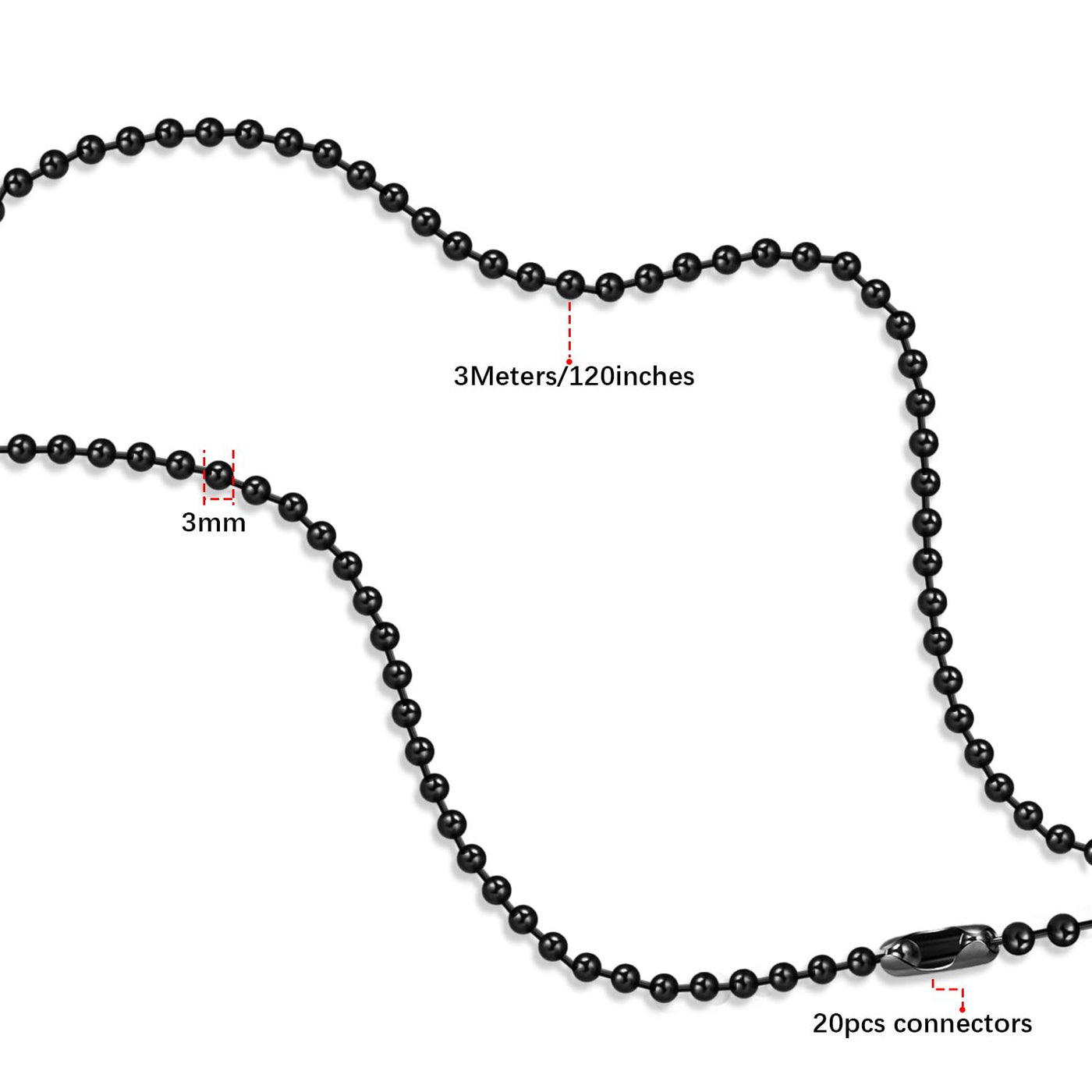 Dotlite Black Ceiling Fan Pull Chain, 120'' Extra Long Rust Proof 3Mm Beaded Ball Light Pulls Extension Chains With 20Pcs Connec