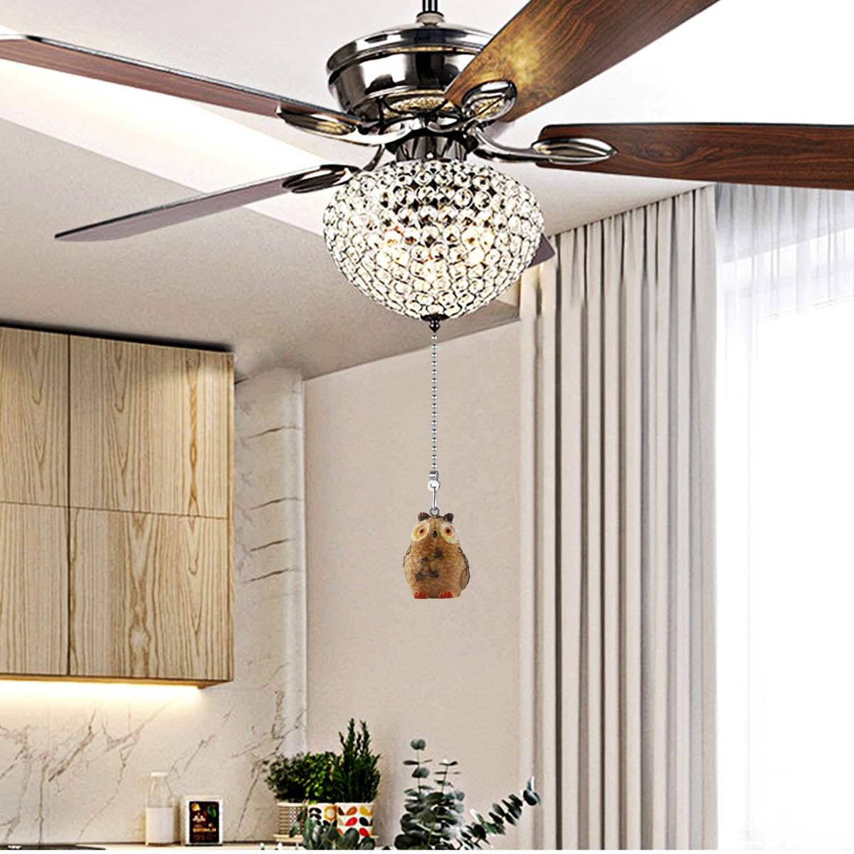 Q: How do I install the owl pull chain for my ceiling fan?A: Installation is easy: simply remove your old pull chain, connect one end of the new pull chain to the switch chain of your ceiling fan, and adjust the length as needed.