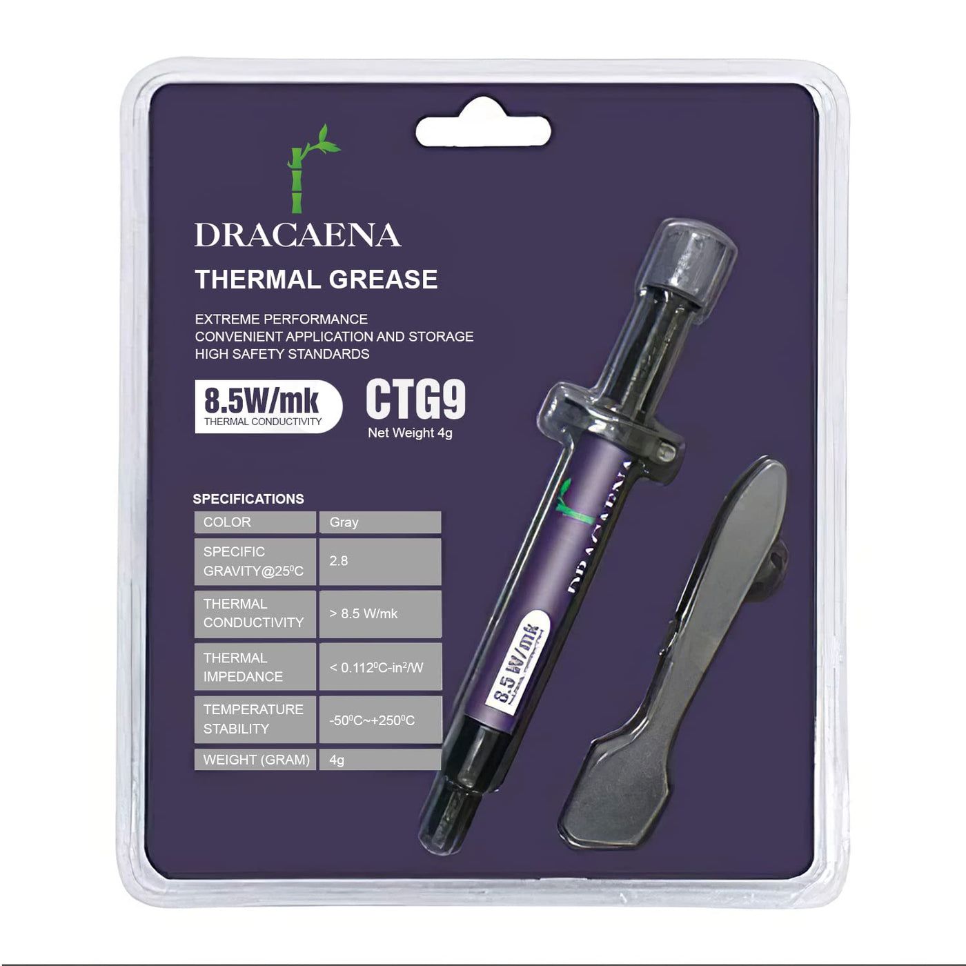 Q: How long does the Dracaena CTG9 thermal paste last?A: The Dracaena CTG9 thermal paste is designed for high durability and can last up to 8 years without compromising its performance, making it a long-term solution for your cooling needs.