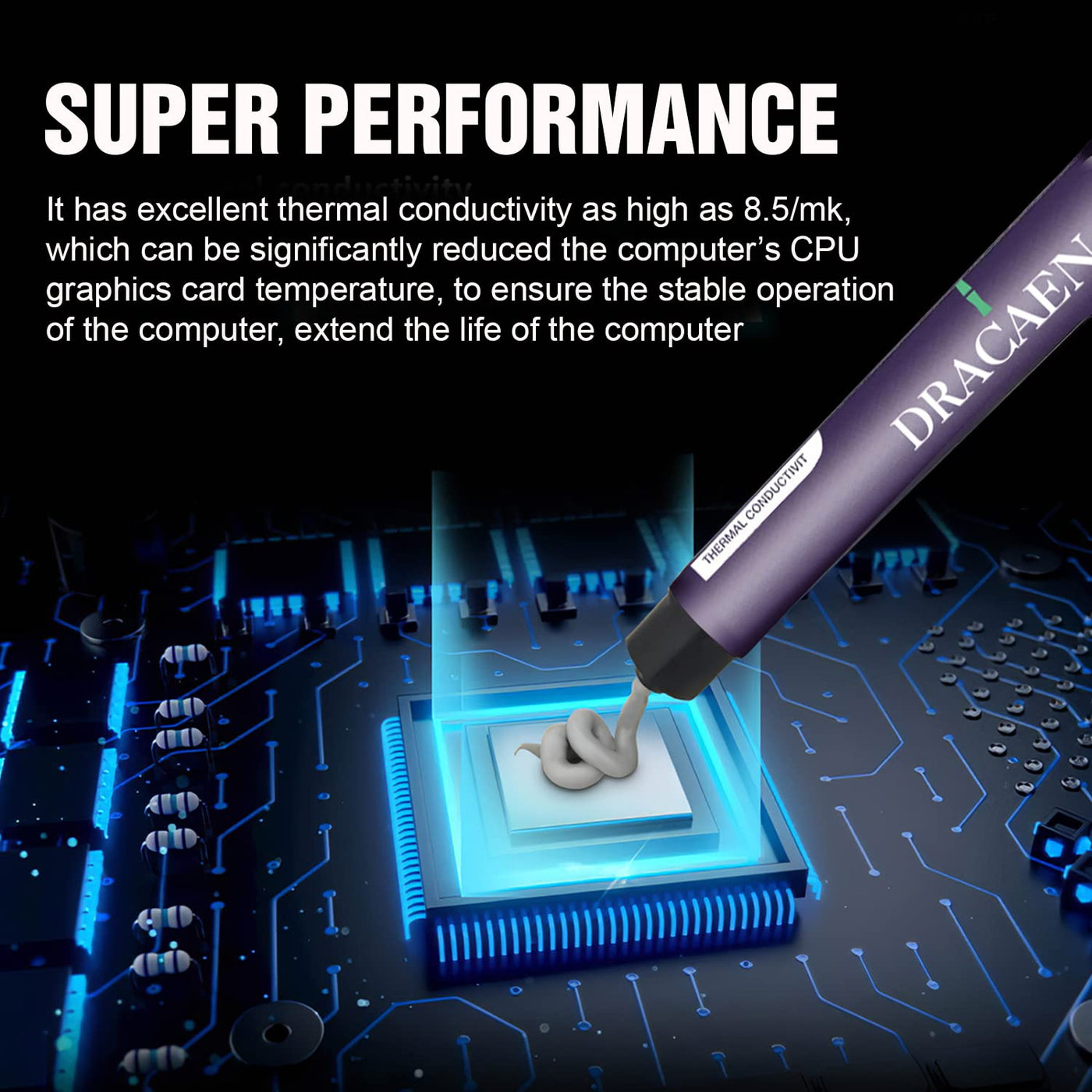 Q: What makes Dracaena CTG9 thermal paste different from other thermal compounds?A: Dracaena CTG9 thermal paste is composed of carbon micro-particles, providing exceptional thermal conductivity of 8.5 W/mK, which allows for superior heat dissipation compared to traditional thermal pastes. This unique formulation ensures your CPU and GPU perform at their best without overheating.