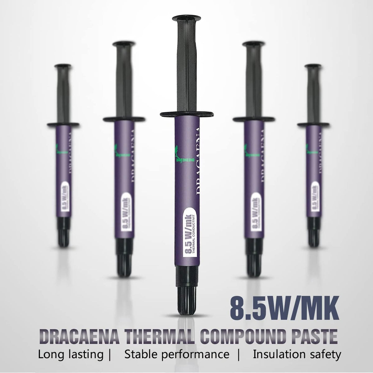 Q: What is the thermal conductivity rating of Dracaena Thermal Compound?A: Dracaena Thermal Compound has a thermal conductivity rating of 8.5 W/mK, which indicates its exceptional heat dissipation capacity and ability to enhance system performance.