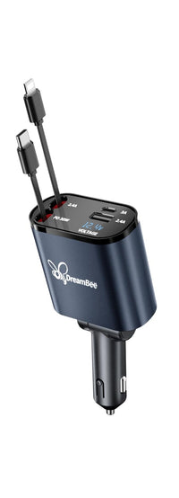 Q: Can I charge multiple devices at once with this charger?A: Yes, the DreamBee Retractable Car Charger is designed to charge up to four devices simultaneously. It includes a PD30W fast-charging Type-C retractable cable, an 18W fast-charging IOS retractable cable, and additional USB-C and USB-A ports.