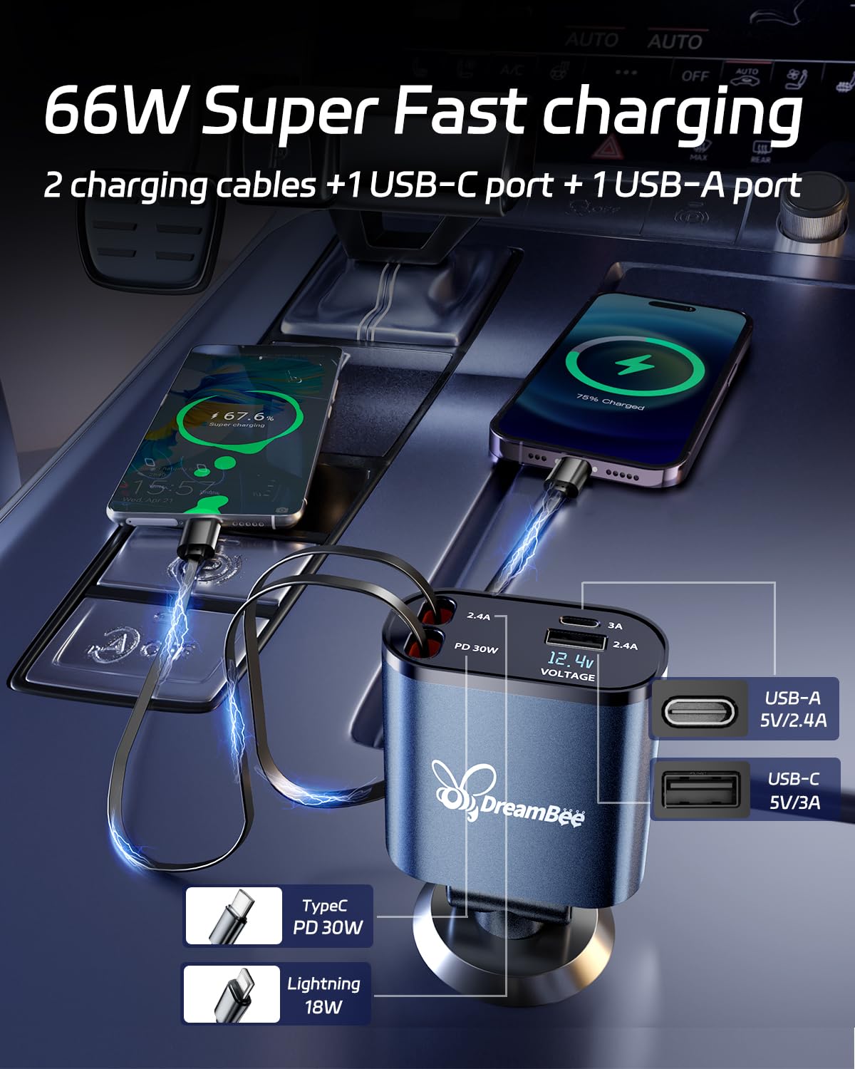 Dreambee Retractable Car Charger,66W 4 In 1 Super Fast Charge Car Phone Charger,Retractable Cables (31.5 Inch) And 2 Usb Ports C