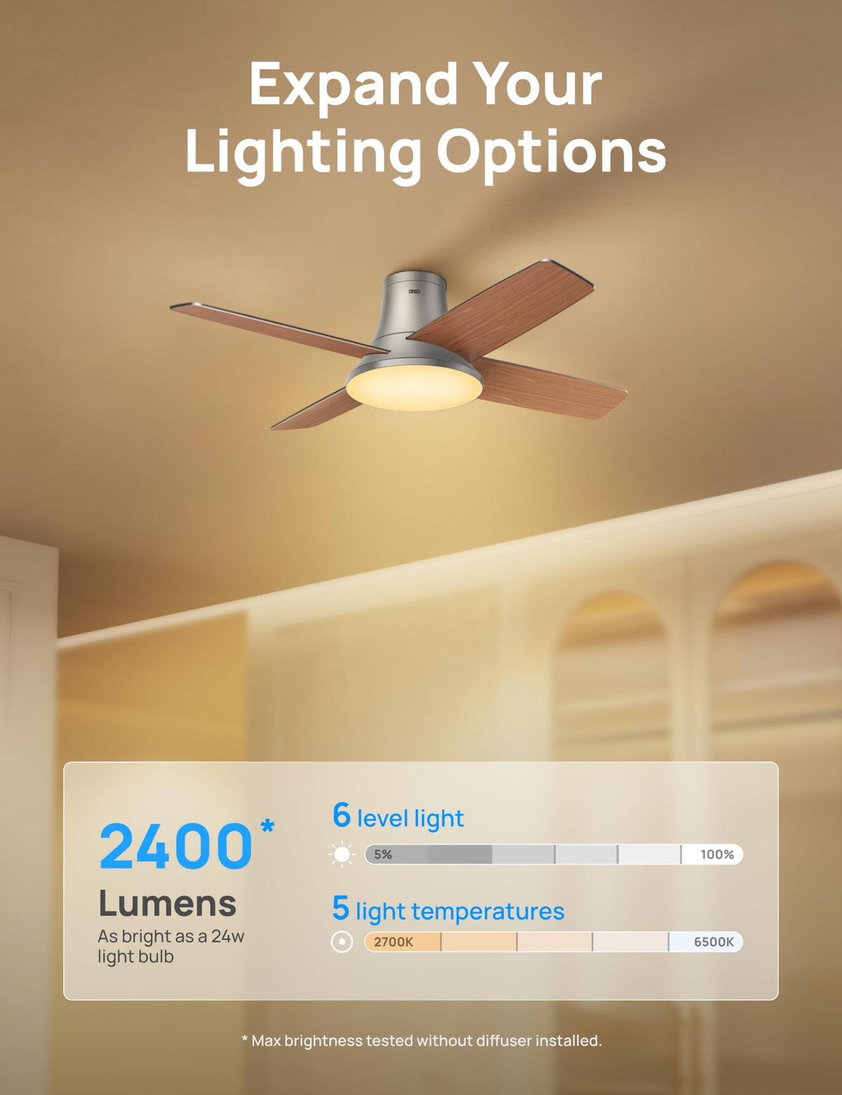 Give Your Home A Brighter Look: With 6 Brightness Levels (Up To 2400 Lumens, Equivalent To A 24W Led Bulb), And 5 Light Tones (2700K To 6500K), The Low Profile Ceiling Fan With Lights Gives Any Room A Modern Look, Be It For Bedrooms, Living Rooms, Or Kitchens. | Large Winds, Tiny Noise: Boasting 6 Speed Settings And Aerodynamically Curved 14