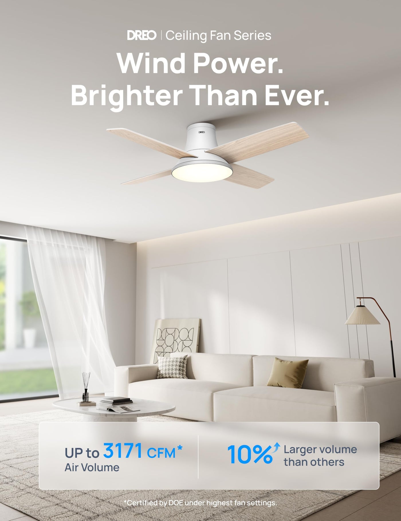 Q: Is the Dreo Ceiling Fan suitable for large rooms?A: Yes, the Dreo Ceiling Fan is designed to provide powerful airflow with an average CFM of 2102 and a maximum of 3171 CFM, making it suitable for medium to large rooms like bedrooms, living rooms, and kitchens.