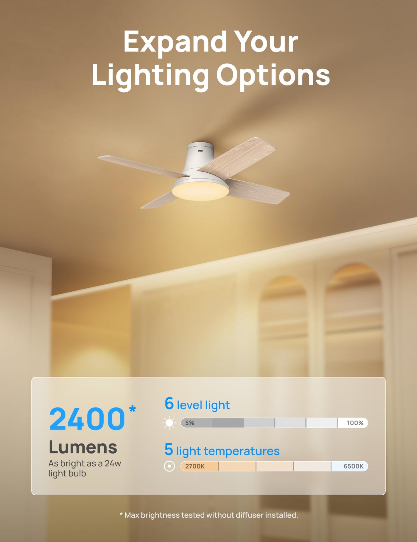 Give Your Home A Brighter Look: With 6 Brightness Levels (Up To 2400 Lumens, Equivalent To A 24W Led Bulb), And 5 Light Tones (2700K To 6500K), The Low Profile Ceiling Fan With Lights Gives Any Room A Modern Look, Be It For Bedrooms, Living Rooms, Or Kitchens. | Large Winds, Tiny Noise: Boasting 6 Speed Settings And Aerodynamically Curved 14