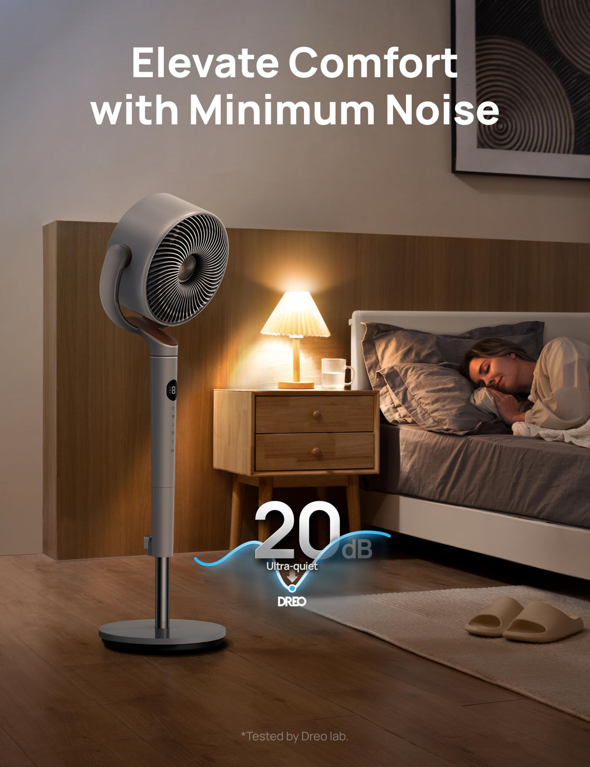 Q: What is the noise level of the Dreo Fan for Bedroom?A: The Dreo Fan operates at a remarkably quiet noise level of just 20dB, making it perfect for use during bedtime or while working, ensuring a peaceful environment.