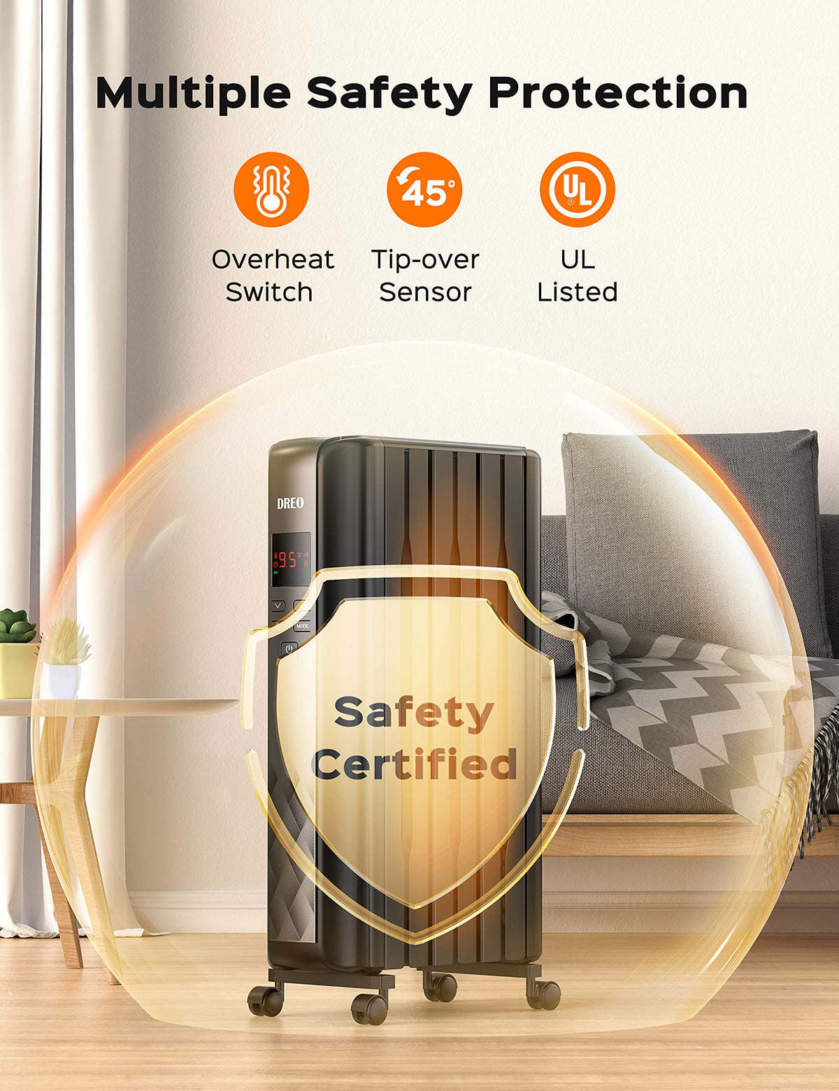 Q: Does the Dreo heater come with safety features?A: Yes, the Dreo Oil Filled Radiator Heater includes enhanced safety features such as a built-in tip-over switch that automatically shuts off the heater if it is tipped over, and it is made of V0 flame retardant materials, certified by UL to ensure safe operation.