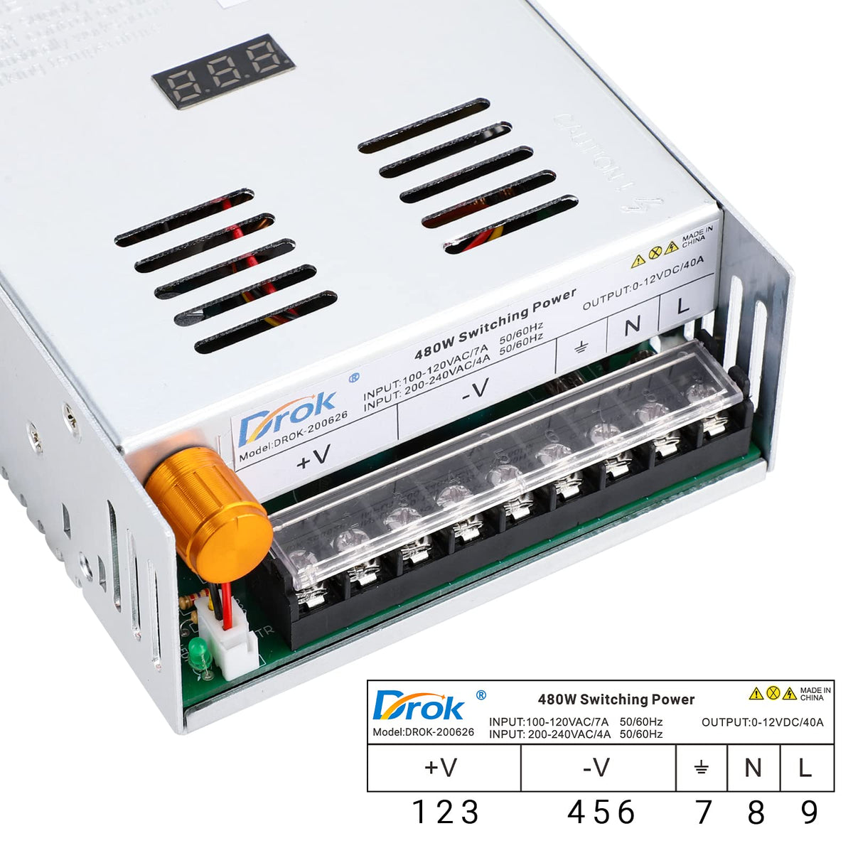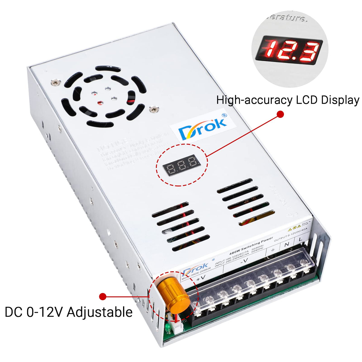 Drok 12V Power Supply, Ac 110V 220V To Dc 0 12V 40A 480W Buck Converter, Adjustable Variable Led Adapter Regulated 5V 6V 9V 12Vo