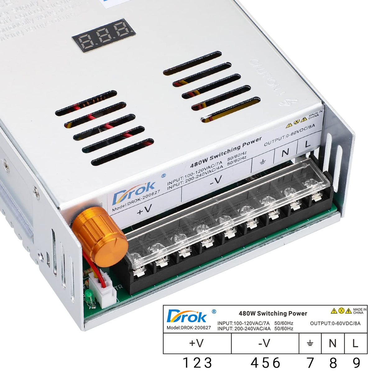 Drok 60V Power Supply, Ac 110V 220V To Dc 0 60V 8A 480W Buck Converter, Adjustable Variable Led Adapter Regulated 5V 12V 24V 30V